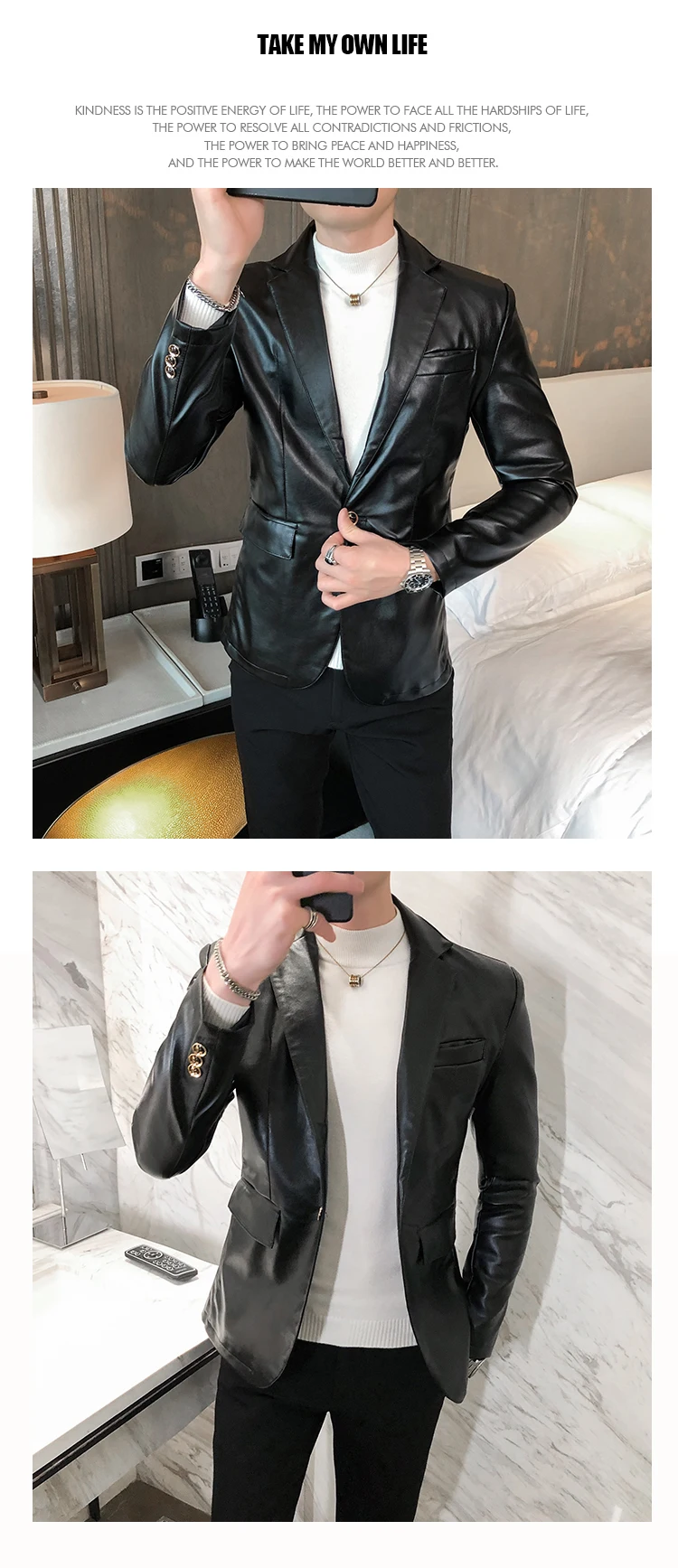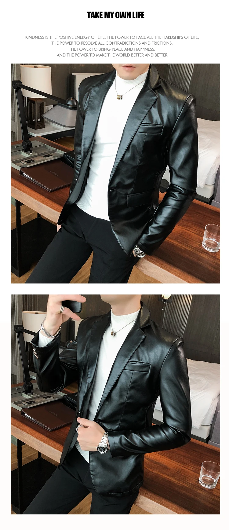 Мужской блейзер из искусственной кожи, однотонный приталенный Блейзер на одной пуговице, деловой Повседневный пиджак в Корейском стиле