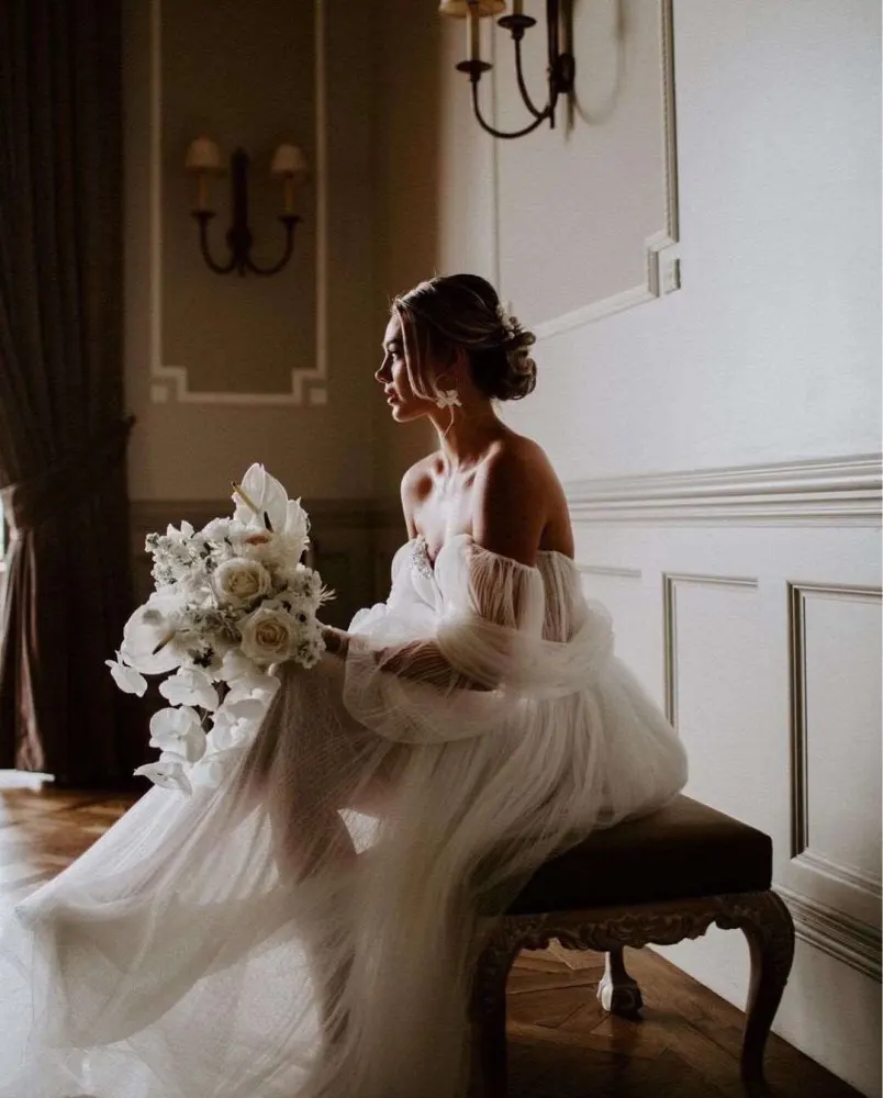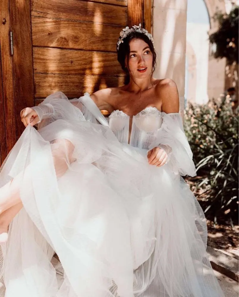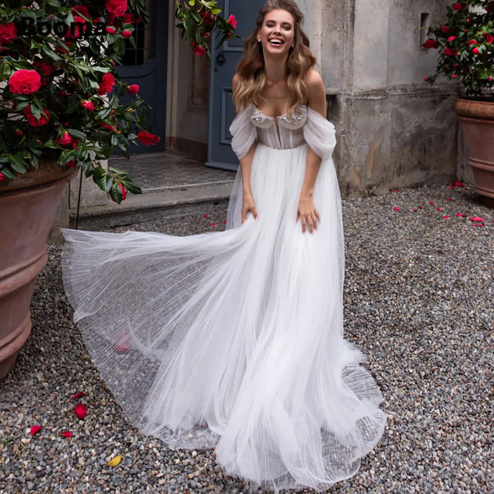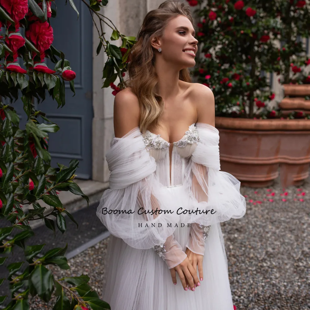 Белое пляжное свадебное платье, платья невесты с открытыми плечами, длинными рукавами, со складками, из тюля, трапециевидного силуэта, 2021