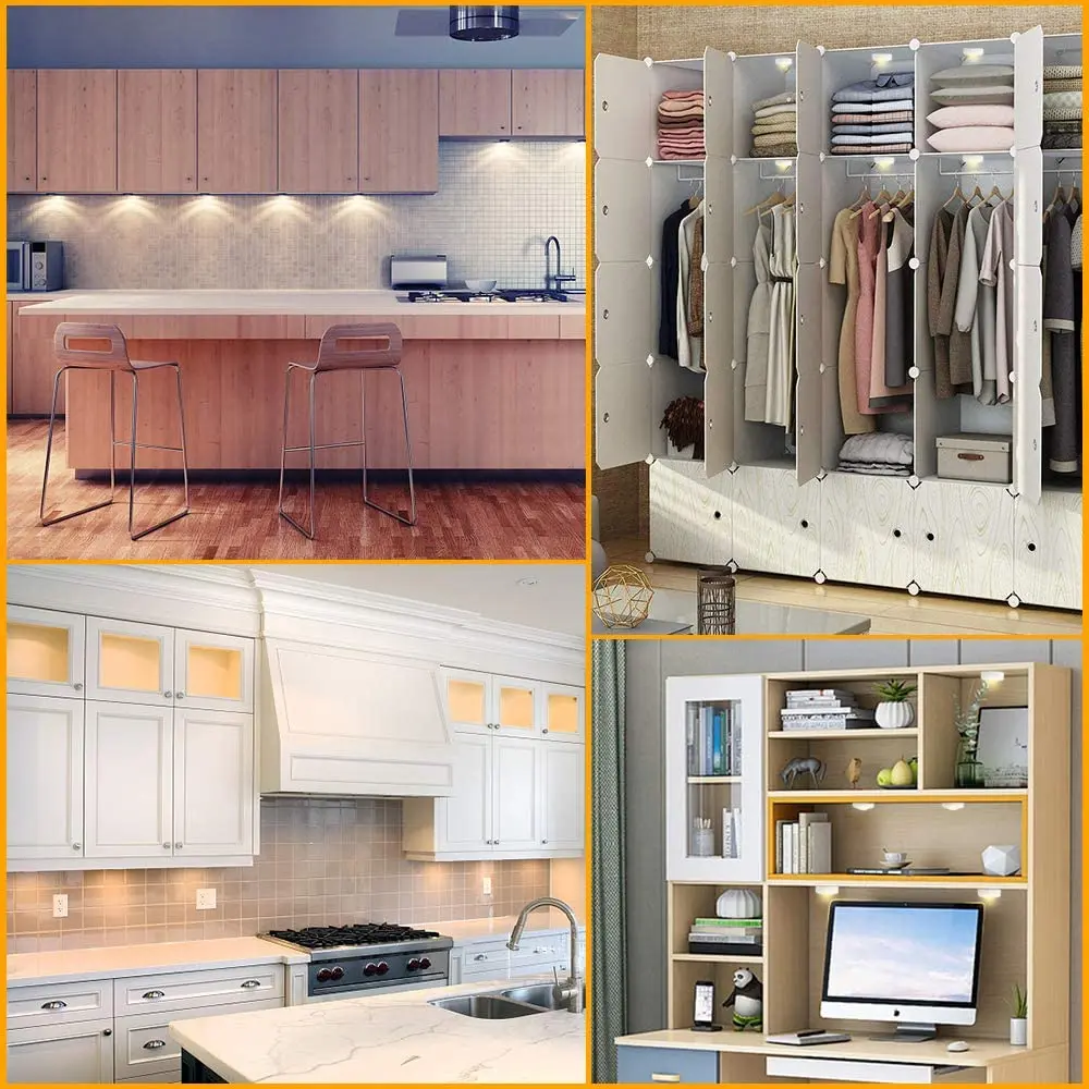 * Легко устанавливается и снимается-беспроводная конструкция, легко вставляется. Каждый светодиодный светильник для шкафа с питанием от 3х батареек AAA (аккумуляторы не входят в комплект, рекомендуются аккумуляторы), быстро устанавливается с помощью оригинальных клейких лент. Подходит для вашей прихожей, кухни, шкафа, спальни, шкафа, книжного шкафа, кладовой, лестницы, ступени, подсобного помещения, подвала и т. д. и yit также может быть как красочная атмосферная лампа.