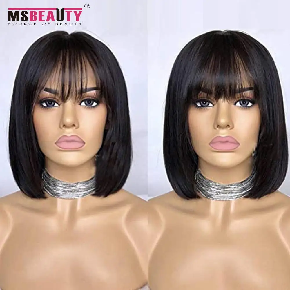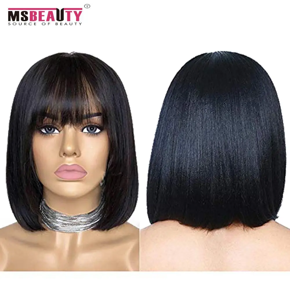 Парик прямой короткий с челкой, с натуральными черными бразильскими человеческими волосами Remy, плотность 150%, среднее соотношение между волосами