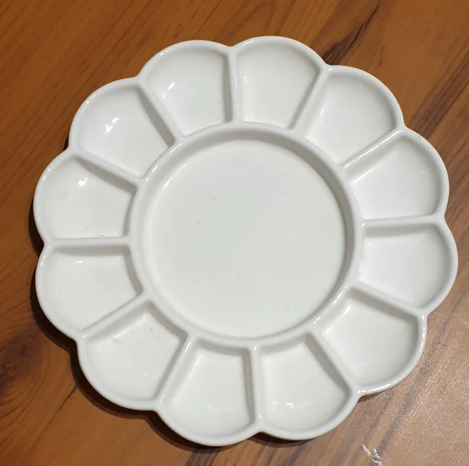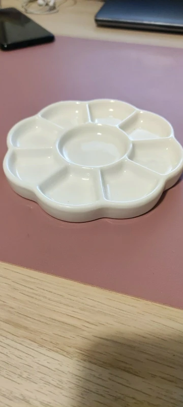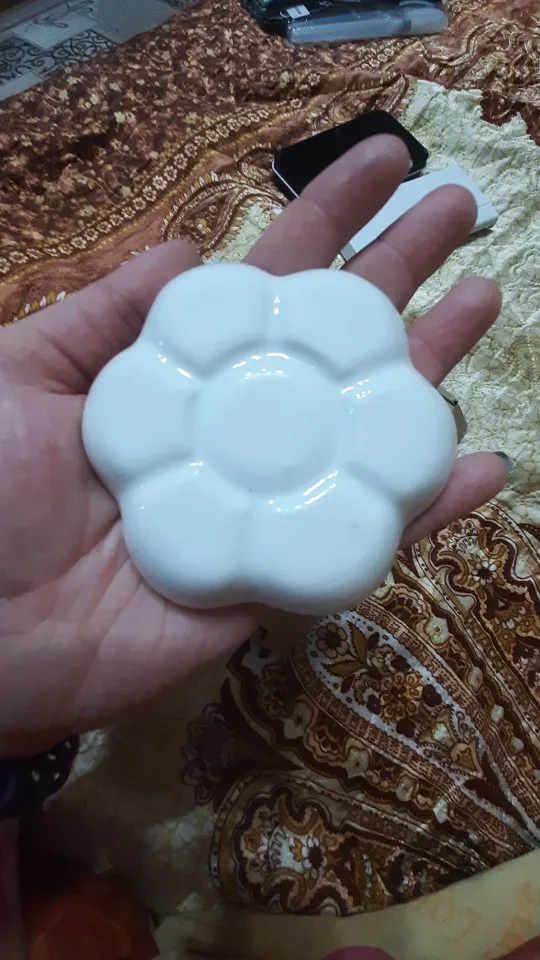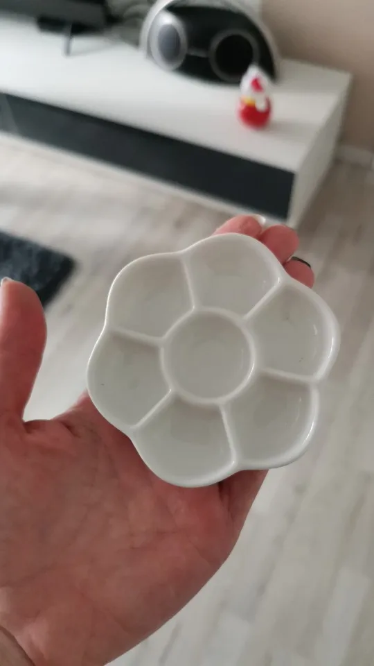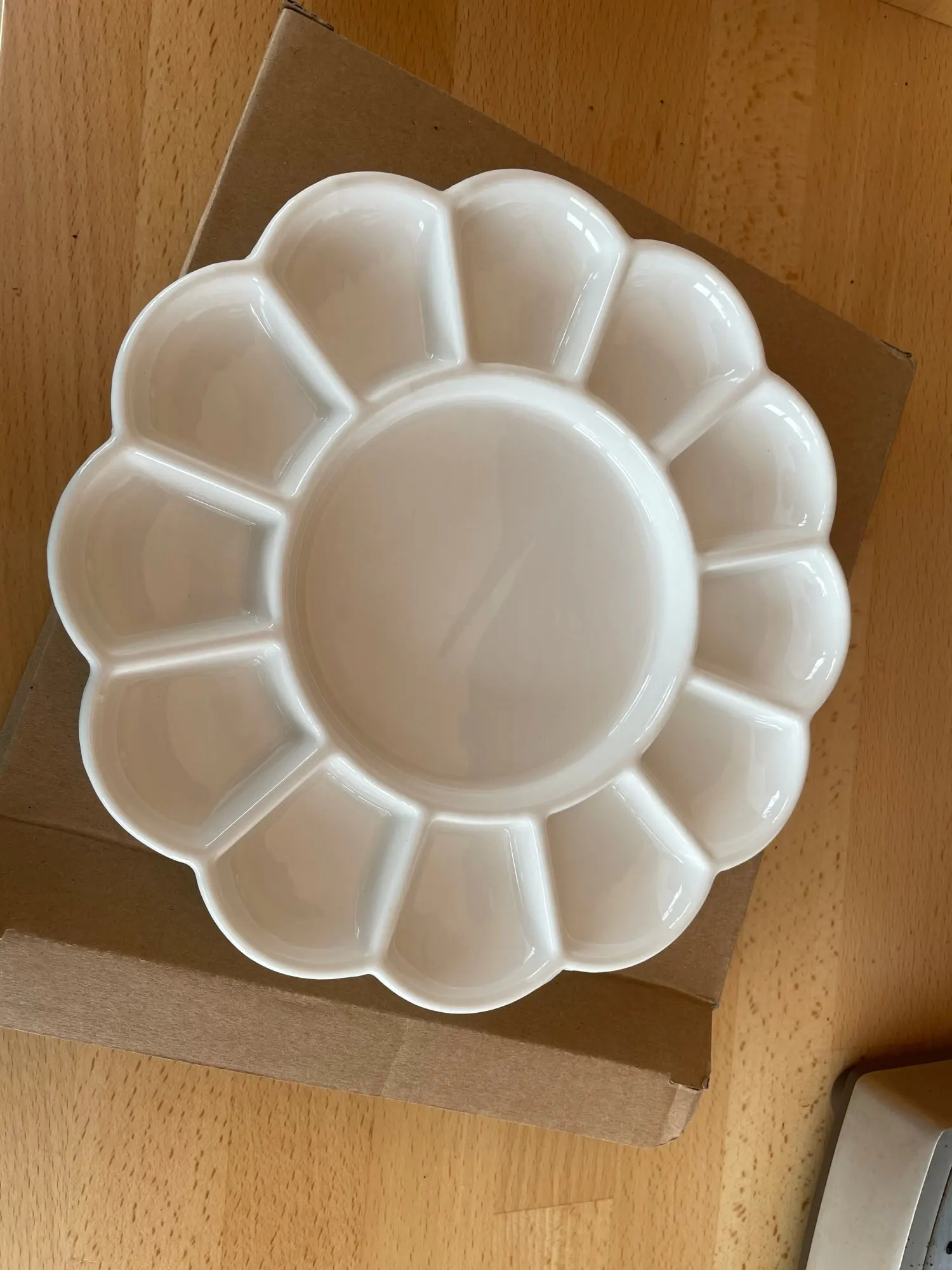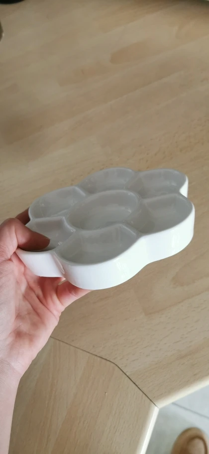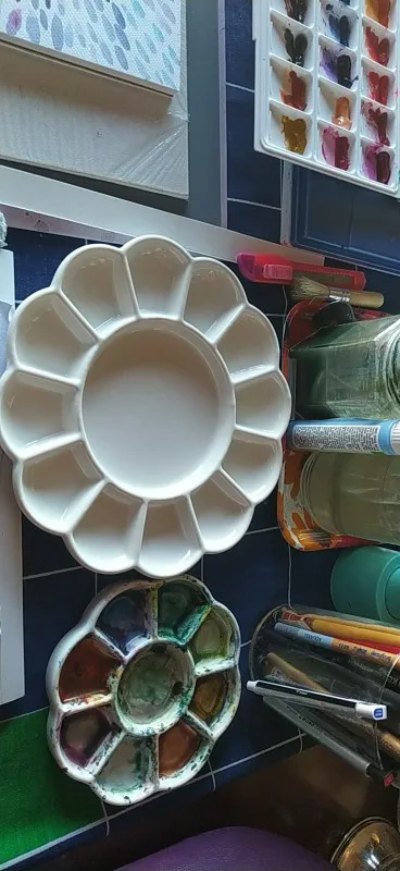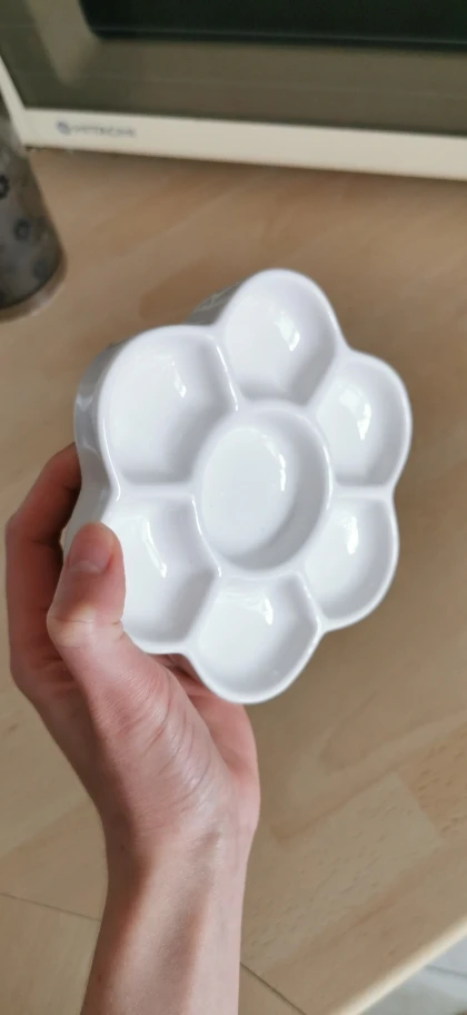 Великолепная палитра! Много отделений, гладкая белая керамика без малейших повреждений, прекрасные размер и устойчивость. Идеально для творчества! Упаковка палитры - очень-очень надежная, выдержала бы и падение из стратосферы) Огромное спасибо!!!