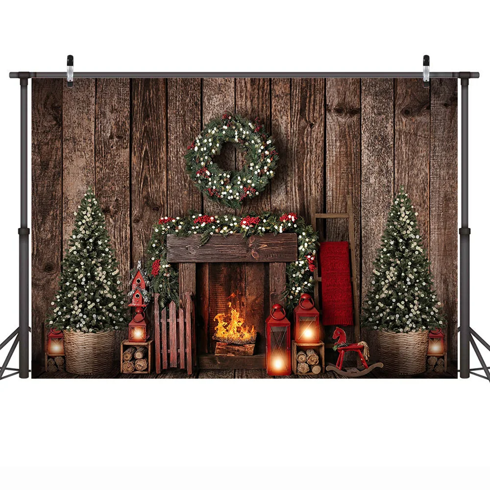 Фон для фотосъемки с изображением рождественского камина деревенской деревянной стены, рождественской елки венка, зимний фон для портретной фотосъемки новорожденных