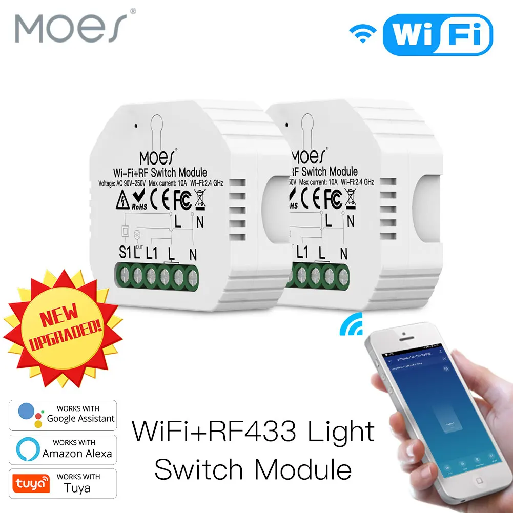 Умный мини-модуль переключателя Smart Life/Tuya, Wi-Fi, RF433, дистанционное управление через приложение, работает с Alexa Google Home, для сброса и переключателя, 1 группа, 1/2 каналов, мультиуправление От Moes