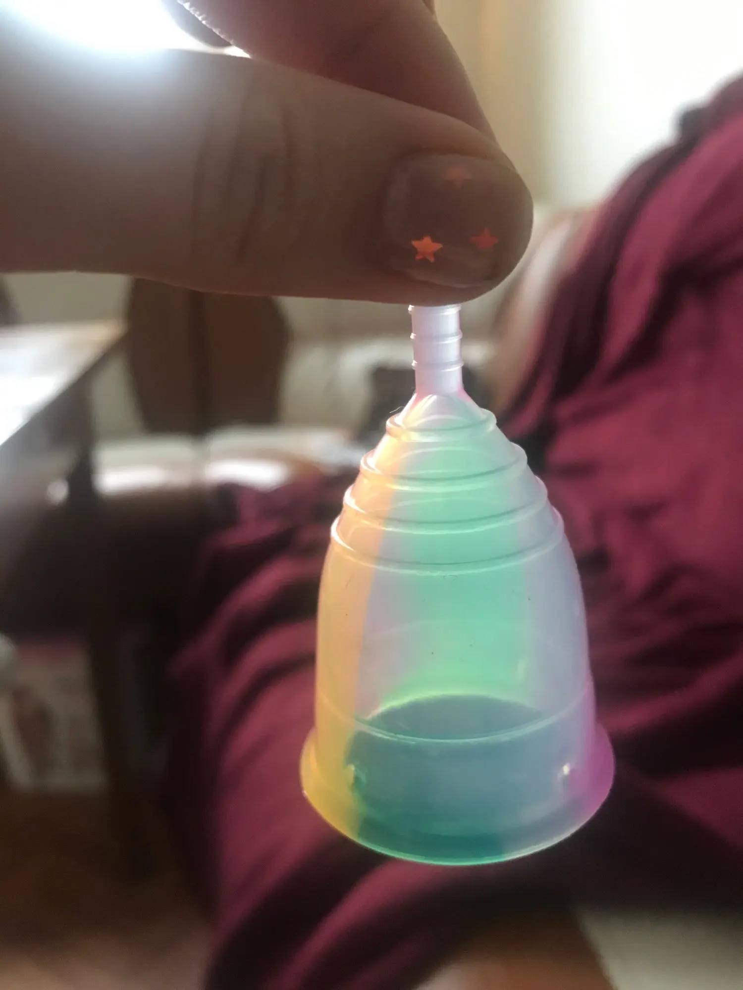 продавец быстро отправил товар, пришол за 3 недели, это не первая моя менструальная чаша(пользуюсь ими 4 года), 1+ это то что чаша глянцевая-на моё опыте матовые не так комфортно ставить, с глянцевым покрытие быстро и комфортно ставится 2+ размер-я заказала размер S, но у даного продавца меня удевило что размер S у него ещё на 1 размер меньше чем у других продавцов, и я думала что мне не подайдёт, НО всё шикарно я уже попользовалась данной чашей 1 менструацию, ни разу не потекла, комфортно себя чувствую так как вооообще не чувствую чашу, (мне 24 года, ещё не рожала, розмер S подайдёт подростку и девушке которые ещё не рожали.) ну и 3+ очень красивая расцветка :-))) радует ни смотря на ситуацию)) Всем хорошего настроения!