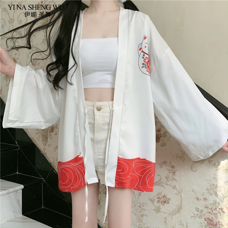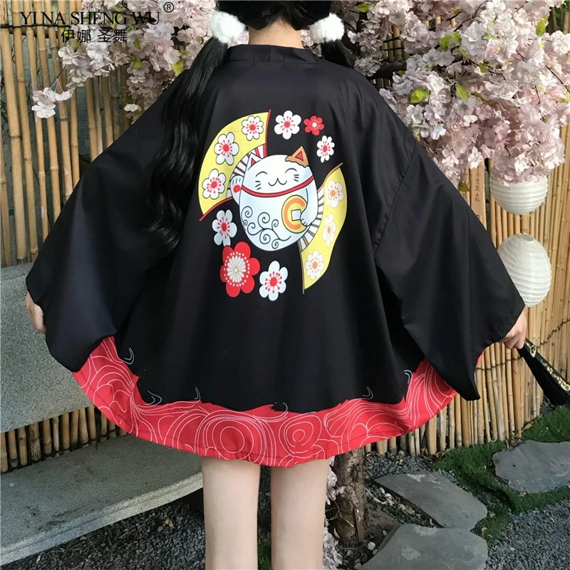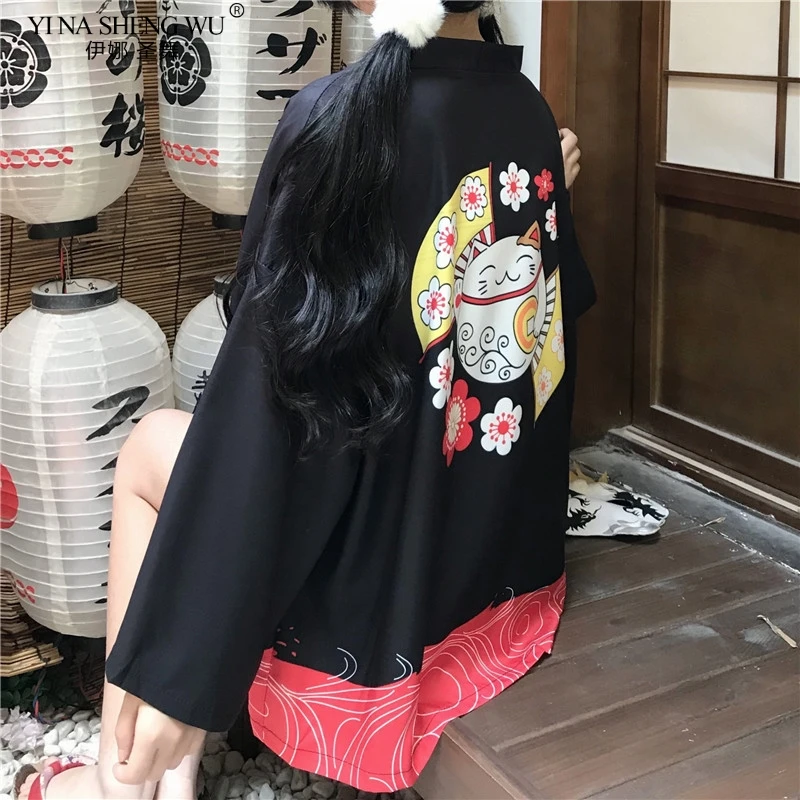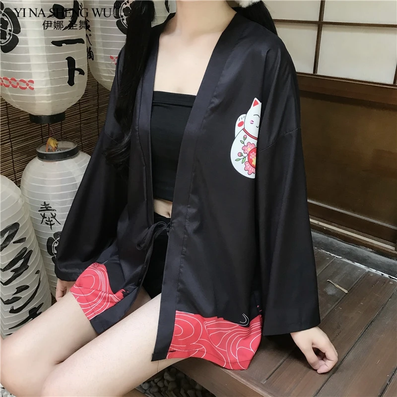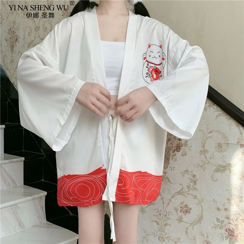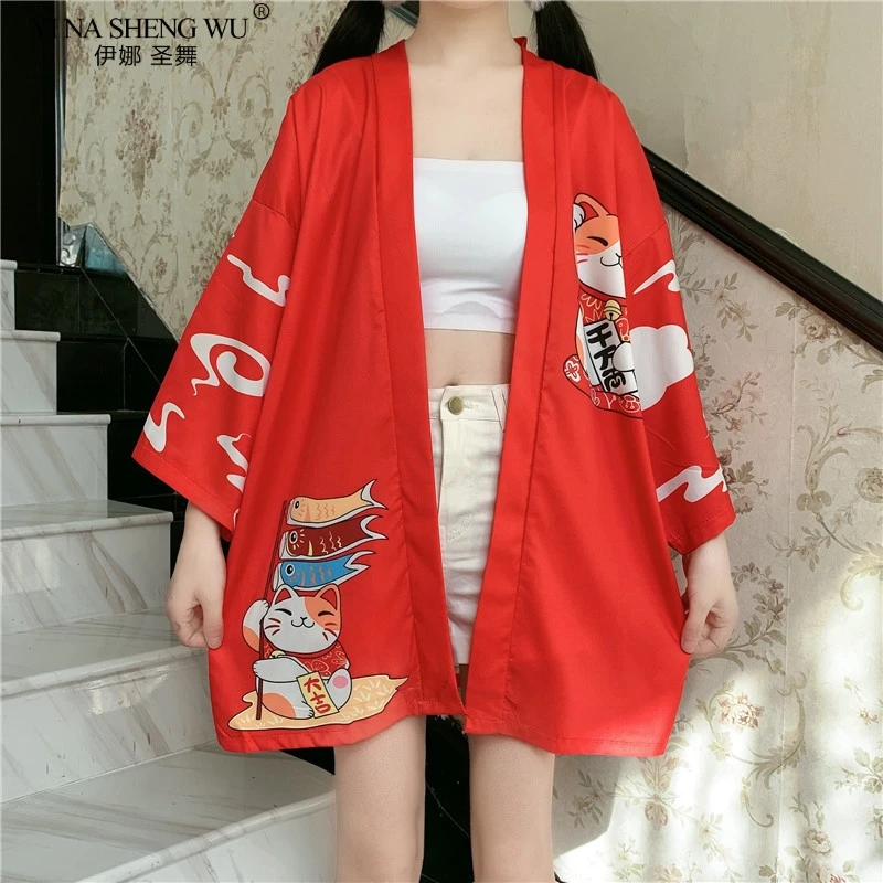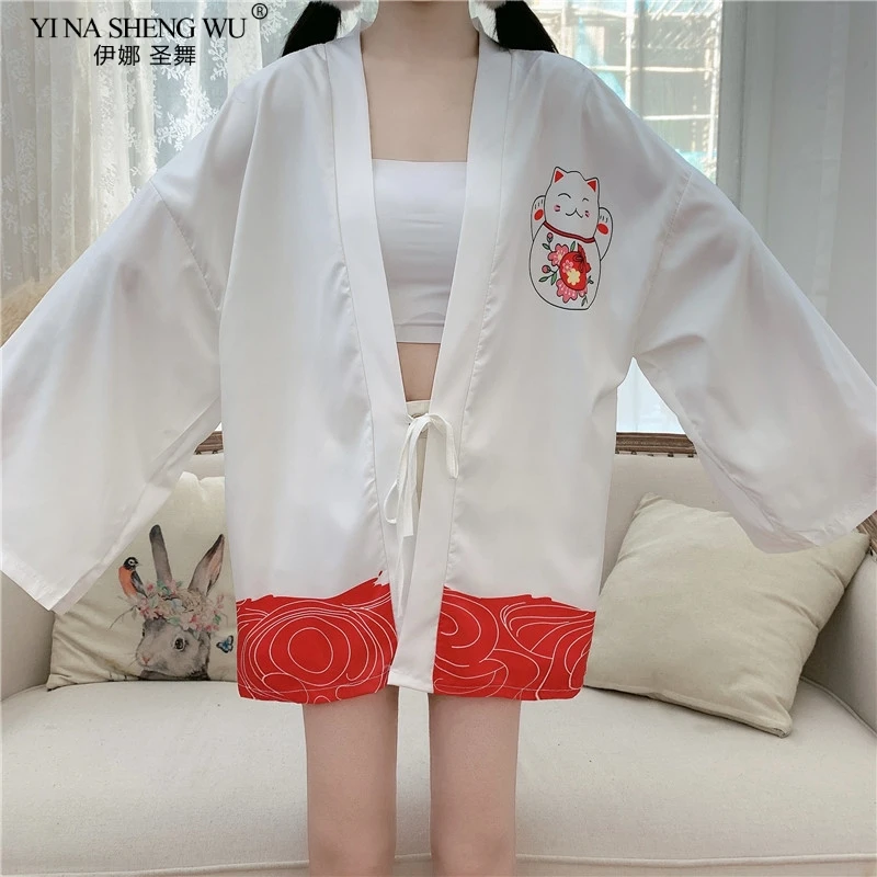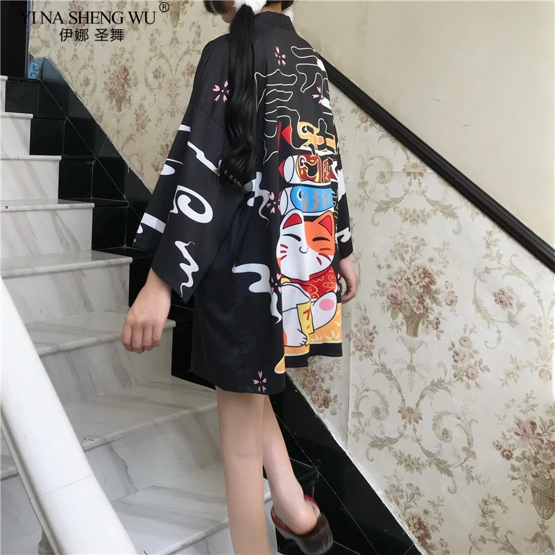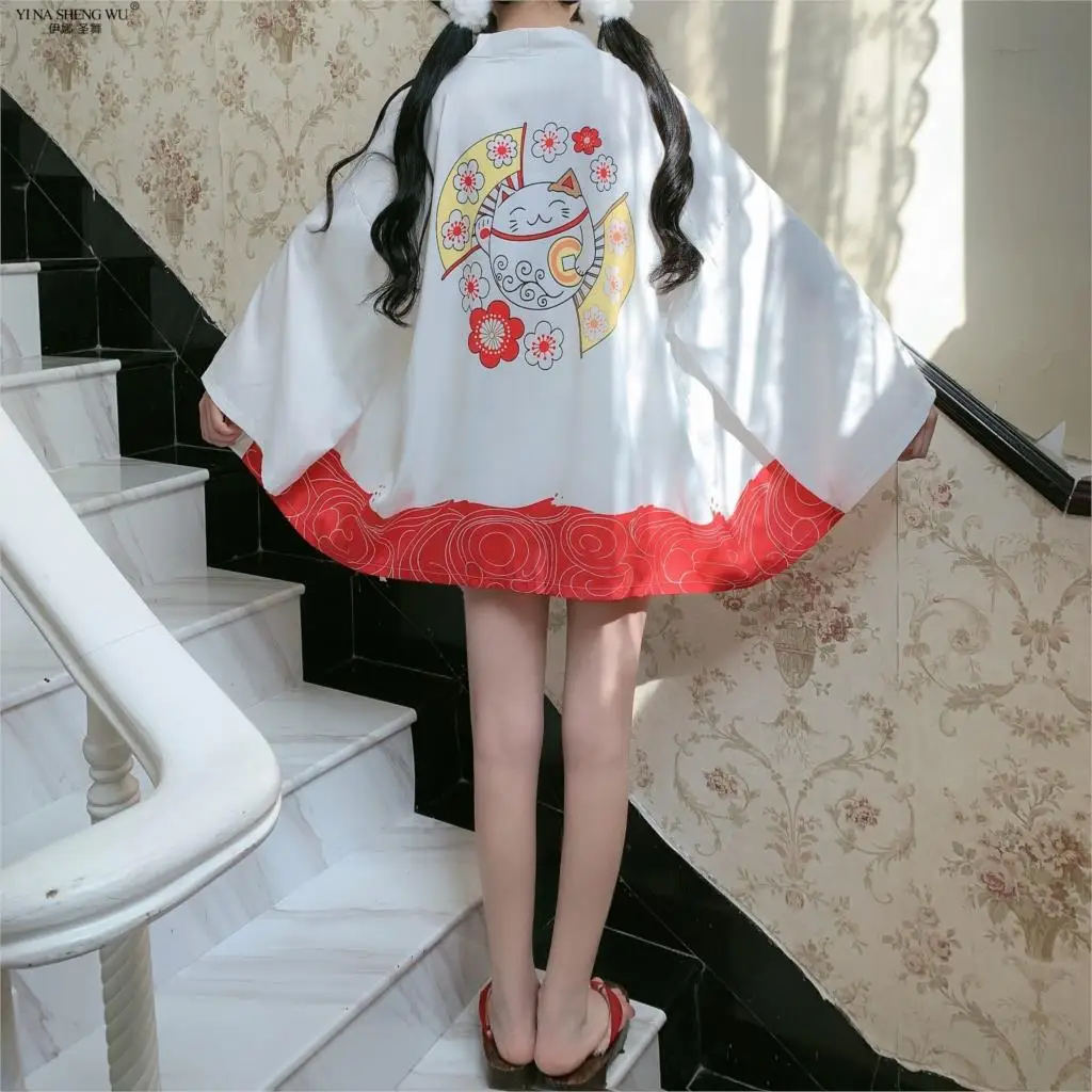 Кимоно с принтом кота в японском стиле, новинка, кардиган, женская Свободная Повседневная рубашка, топы, Kawaii Kimonos, пальто, Yukata, для девочек, Harajuku, азиатская одежда