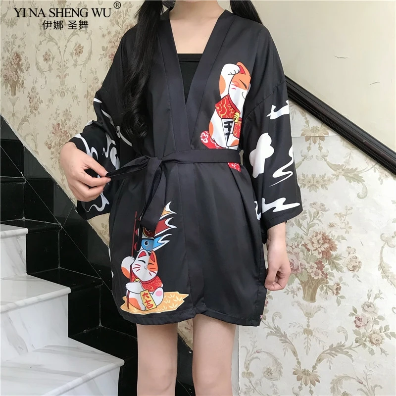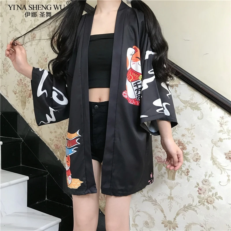 Кимоно женское с принтом кошки, повседневный Свободный кардиган с японским принтом, юката, Харадзюку, азиатская одежда
