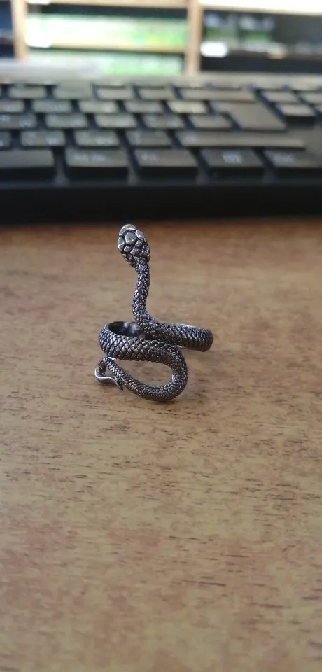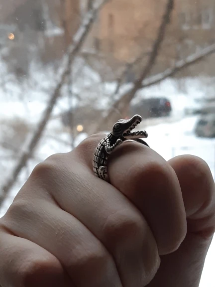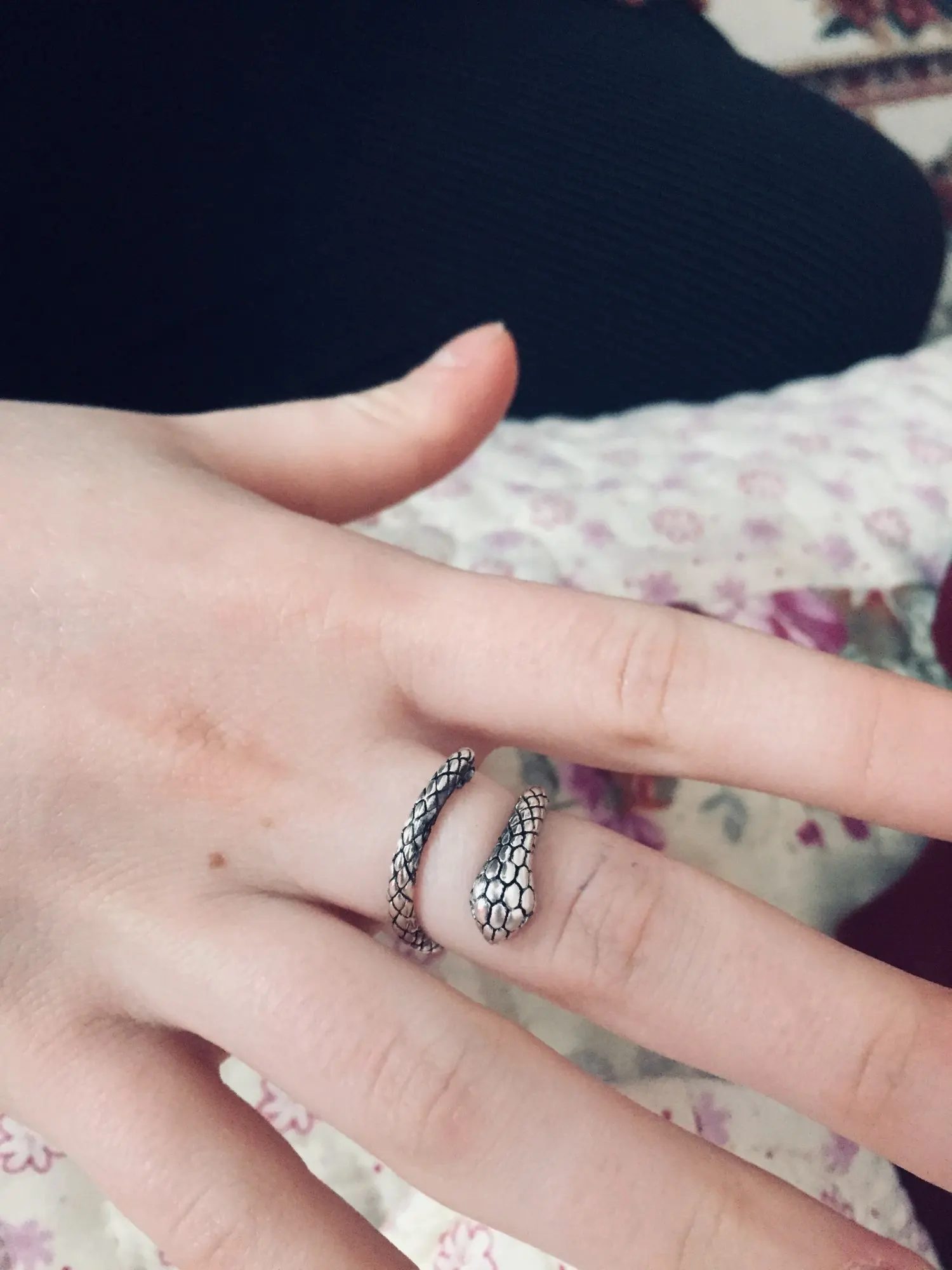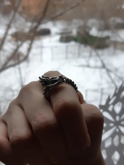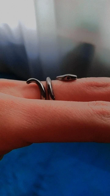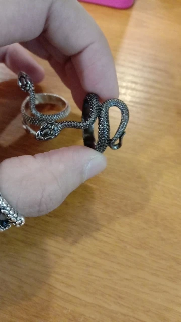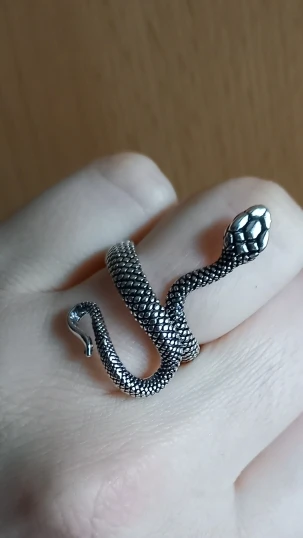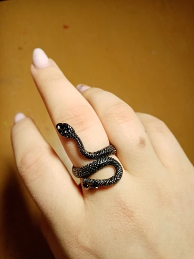 Хорошее кольцо. У меня тонкий костлявые пальцы, мне подходит только на большой или указательный. А если затянуть сильнее то будет не красиво. Минус то что не сочетается с другими кольцами, лично у меня, и если надевать змею, то другие кольца лучше снять.
