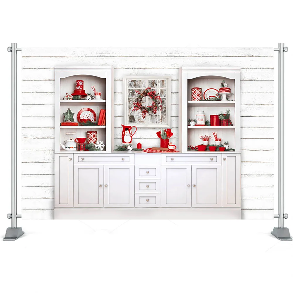 Рождественский фон для фотосъемки буфет деревянная стена Рождественский венок фоны красная посуда фон для фотобудки