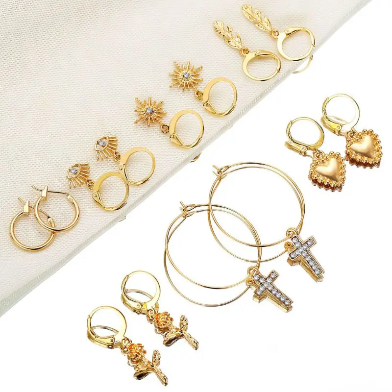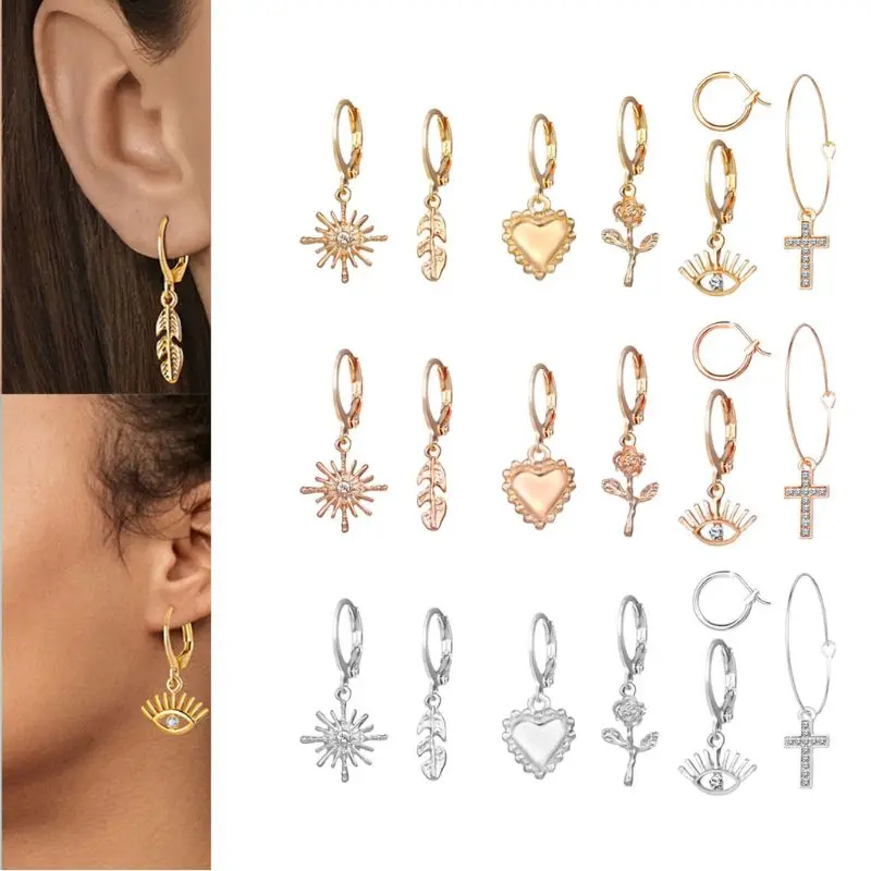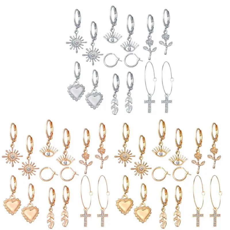 7 пар, серьги-кольца с кристаллами и крестиком в виде сердца, серьги-подвески с цветком и листьями, серьги-подвески Huggie, женские модные ювелирные украшения