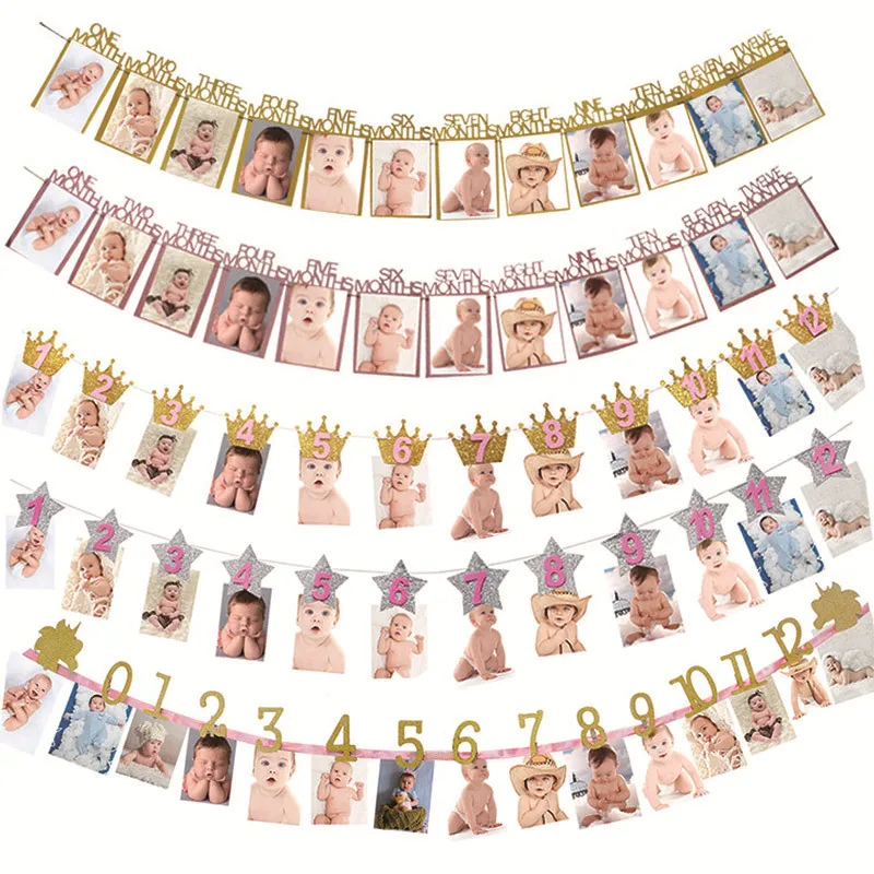 Детский душ дети Frist баннеры для дня рождения 12 месяцы фоторамка...