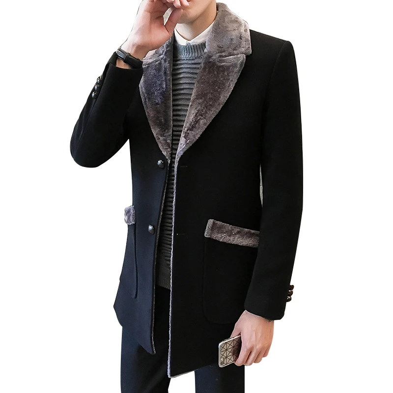 Тренчкот с меховым воротником, мужское зимнее пальто из смесовой шерсти, приталенное, Мужское пальто средней длины, черного, серого цвета, синего цвета, размеры M 5XL