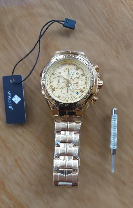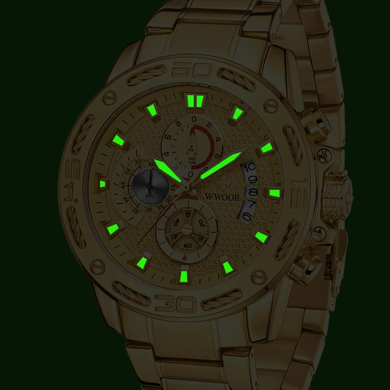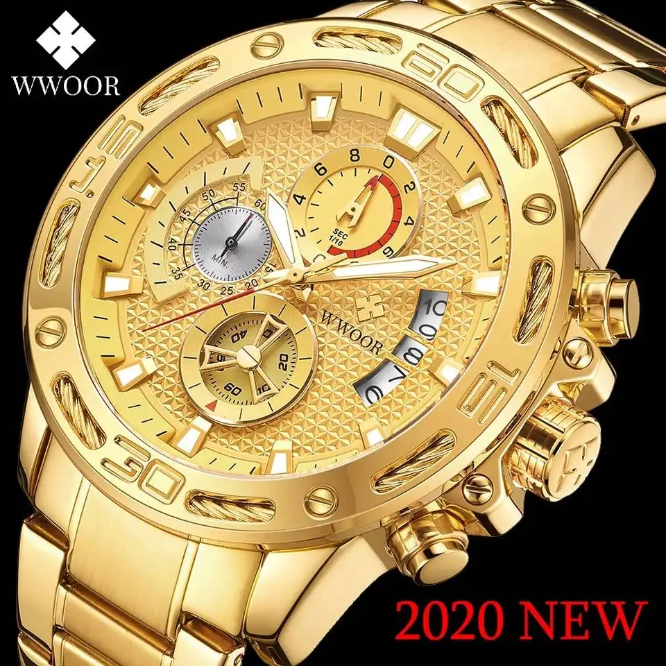 Мужские кварцевые часы WWOOR, водонепроницаемые золотые часы из нержавеющей стали, спортивные часы с хронографом, 2021