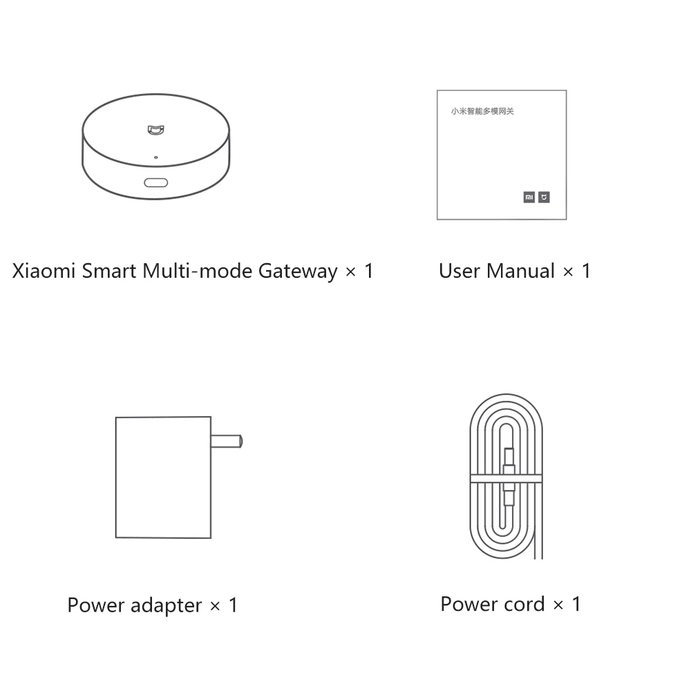 ● Интеллектуальный многорежимный шлюз Xiaomi × 1 ● Руководство пользователя × 1 ● Адаптер питания × 1 ● Шнур питания × 1