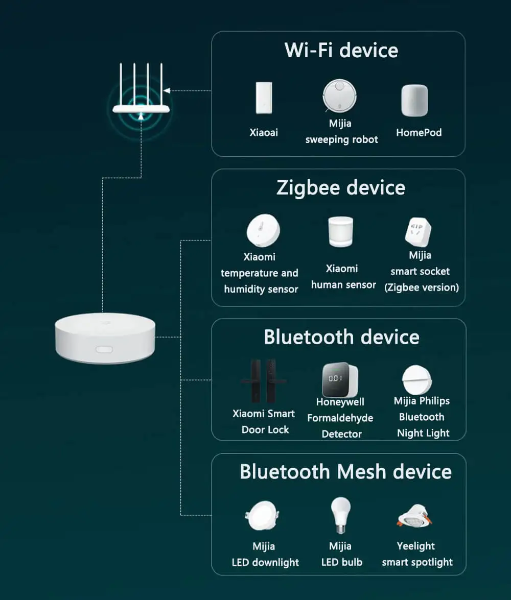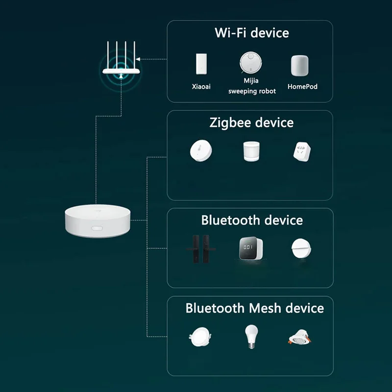 Интеллектуальный многорежимный шлюз Xiaomi поддерживает три устройства протокола связи: Zigbee, Wi-Fi, Bluetooth и Bluetooth-сетка. Один Шлюз может реализовать соединение и взаимосвязь вышеуказанных различных протокольных устройств, что упрощает вам строительство умного дома.
