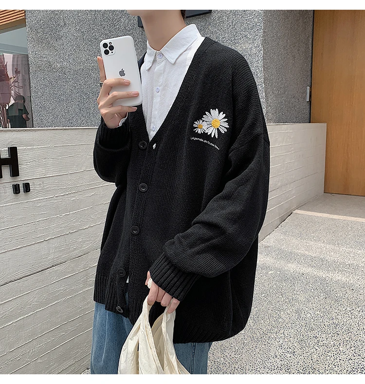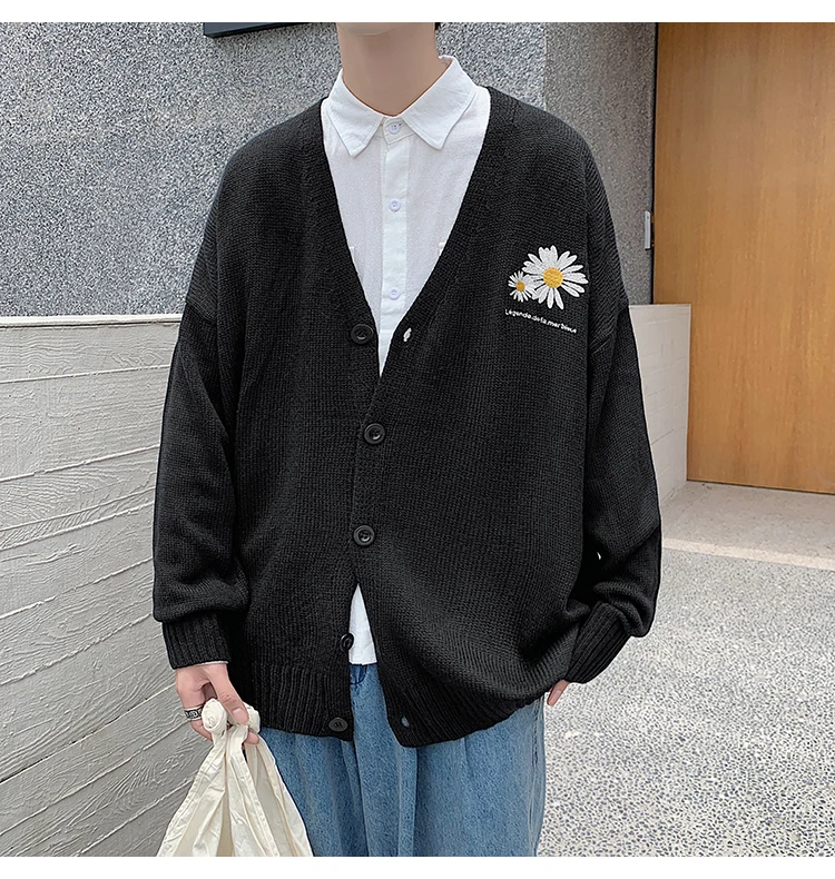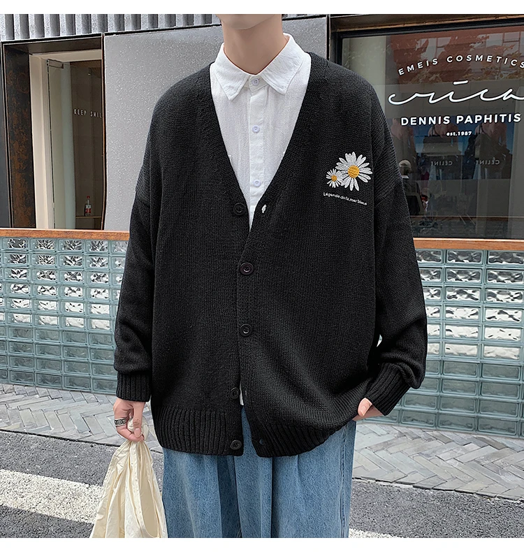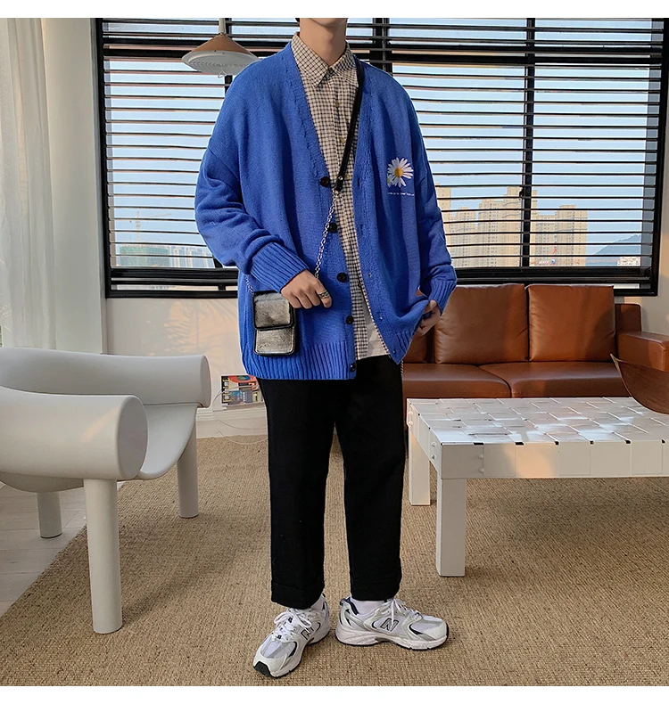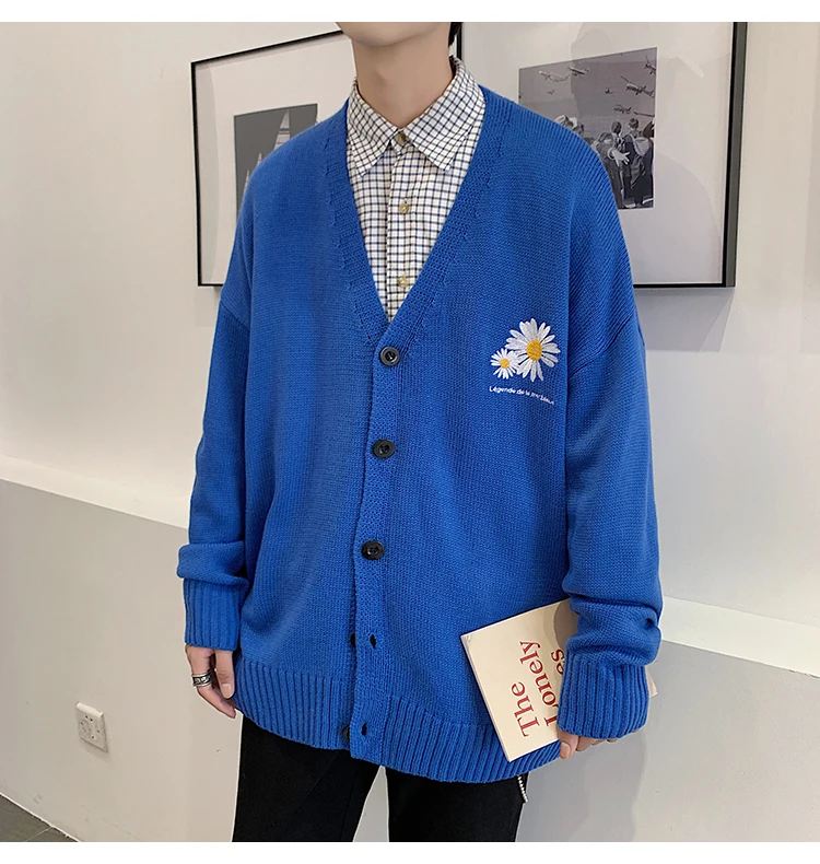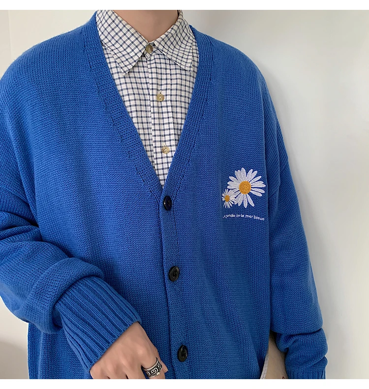 LAPPSTER мужской цветочный кардиган с вышивкой, мужской вязаный свитер на пуговицах, синий модный свитер в Корейском стиле, зима 2021