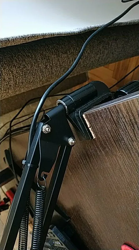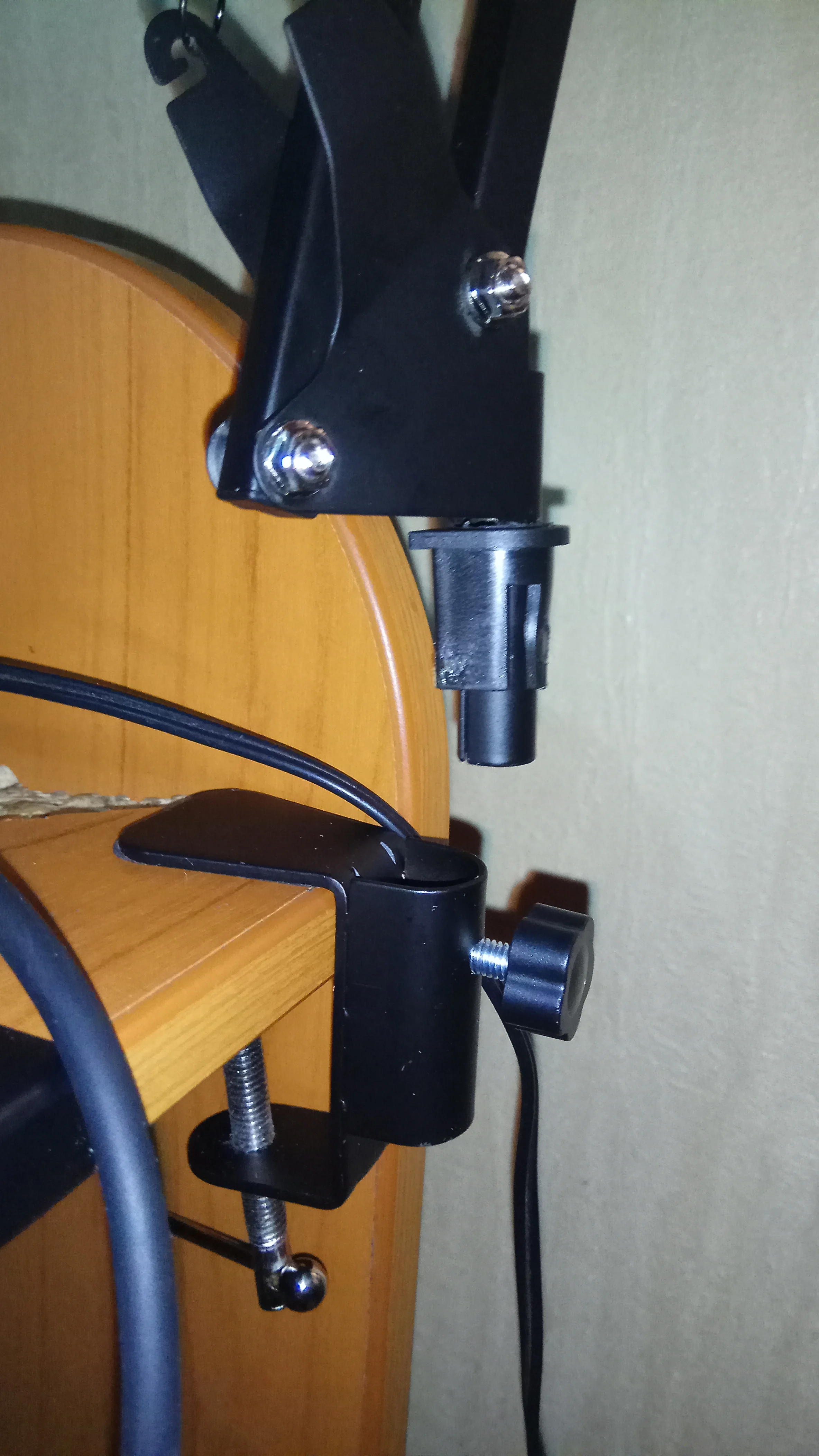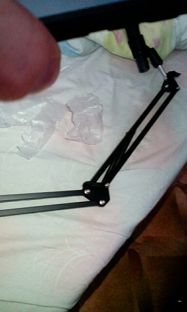 в общем пришел пантограф довольно быстро, забрал распаковал, в коробке казался маленьким, по факту размер идеальный, смотрите что сразу нужно сделать что бы наслаждаться тем как прекрасно он работает, обмотать изолентой место крепления микрофона к пантографу (фото 1), выбросить родное крепление к столу, оно никуда не годится и взять вместо него крепление от дедушкиной лампы (фото 2), я приклеил кусок пробки, что бы стол не царапать, и последнее вставить в крепление распорку, что бы оно не помялось от нагрузки, я сделал затычку из мебельного тычка деревянного (честно не знаю как он называется), обмотал изолентой и вогнал с небольшим натяжением (фото 3)