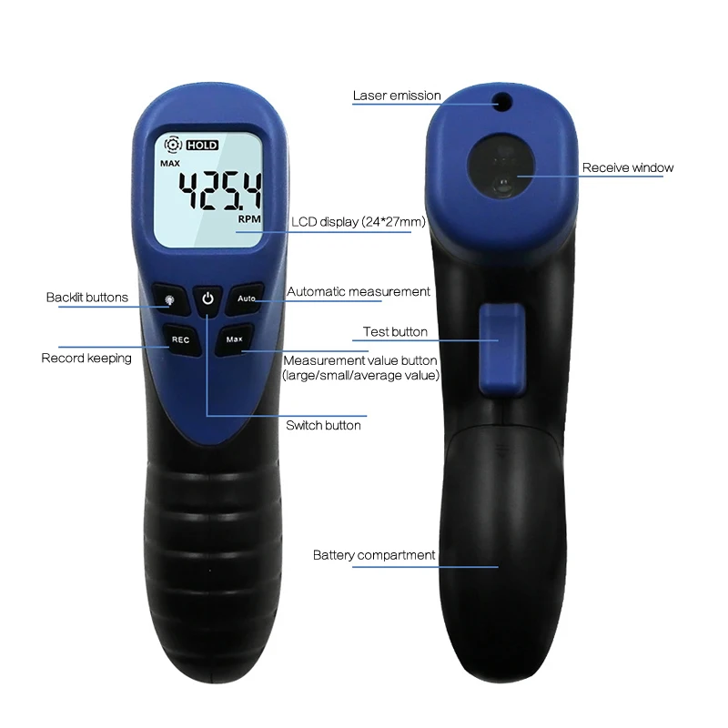 Характеристики: 1. Бесконтактный Ручной цифровой тахометр со стабильной производительностью. 2. Автоматические и ручные режимы измерения для выбора. 3. Широкий диапазон измерений (от 2,5 до 99999 ОБ/мин) и высокое разрешение. 4. Макс./Мин./Средние. Функции записи значений. 5. Функция удержания данных, запись и отзыв данных (60 показаний).6. ЖК-экран с белой подсветкой, легко читается. 7. Возможность измерения на расстоянии от 2-20 дюймов (50-500 мм).8. Автоматическое и ручное Питание. 9. Индикация низкого заряда батареи.