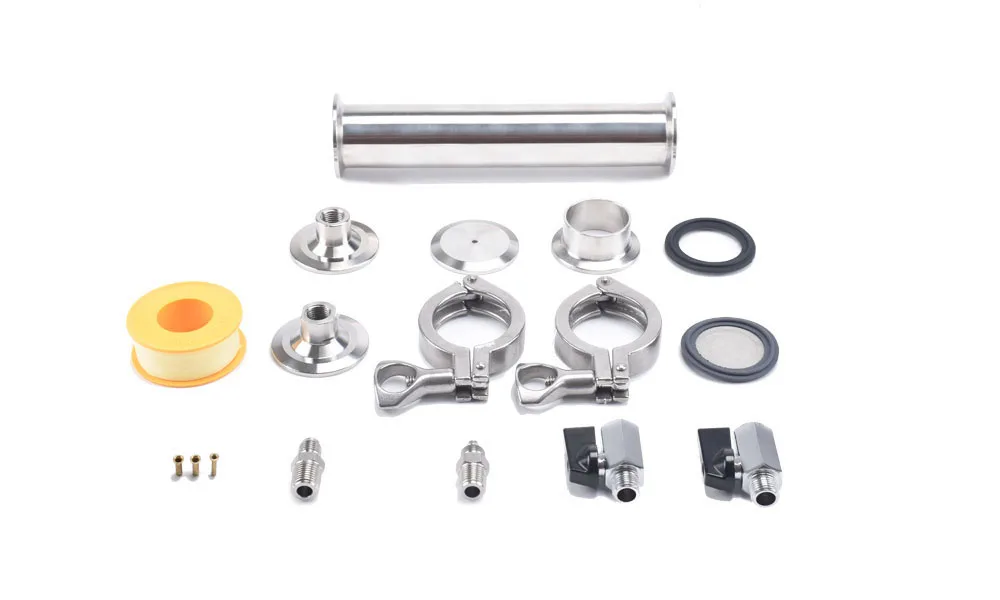 1x1,5 "твердая Торцевая крышка с отверстием 3 мм2xстандартный зажим давления2x1/4 "шаровой клапан высокого давления, FNPT, SS304.2x1,5 "1/4" FNPT заглушки1x30 4 трубки из нержавеющей стали1x1,5 "Наконечник1x1,5 "трехзажимная прокладка дисплея Viton 100 сетка (150 микрон) прокладка1 х Viton tri-clamp 1,5 ”прокладка1x Петро-лента (ПТФЭ Трубная лента)