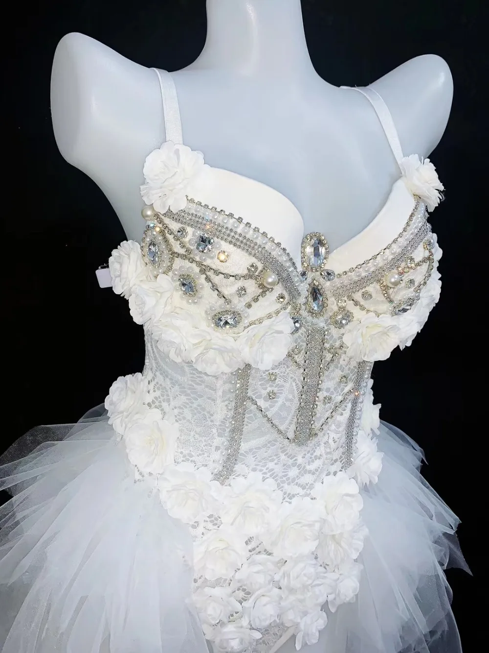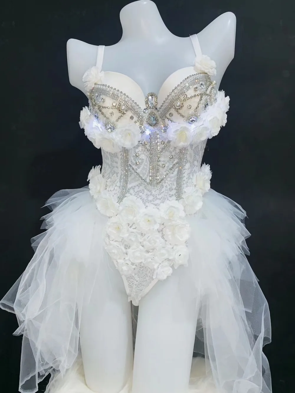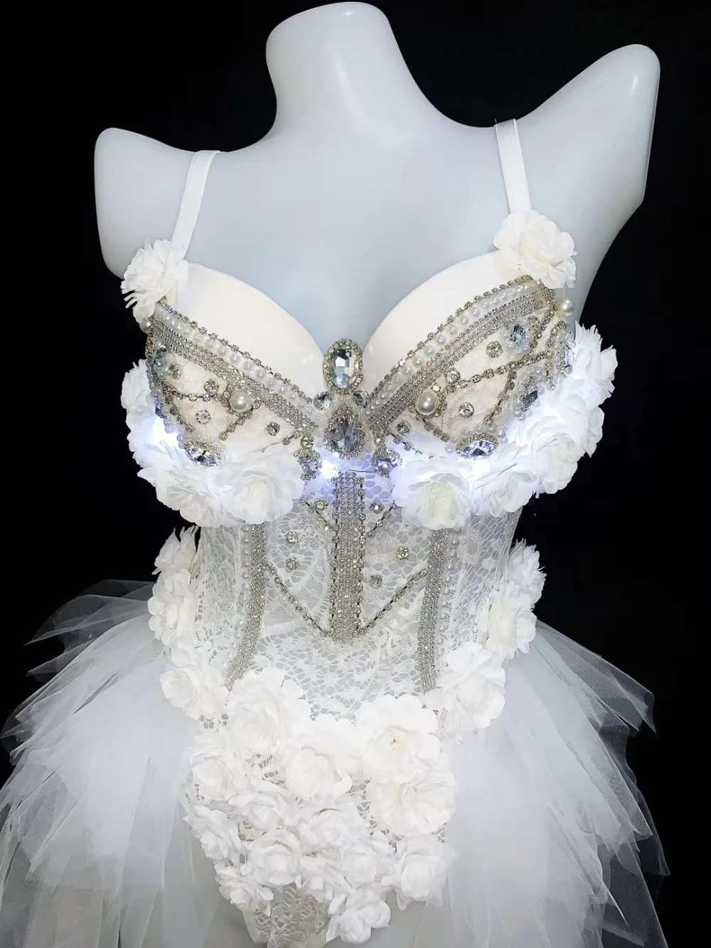 Белые кружевные Стразы, боди с цветами, Милое сексуальное платье для танцев, светодиодный светильник, аксессуары для дня рождения, наряд для вечеринки, одежда для сцены