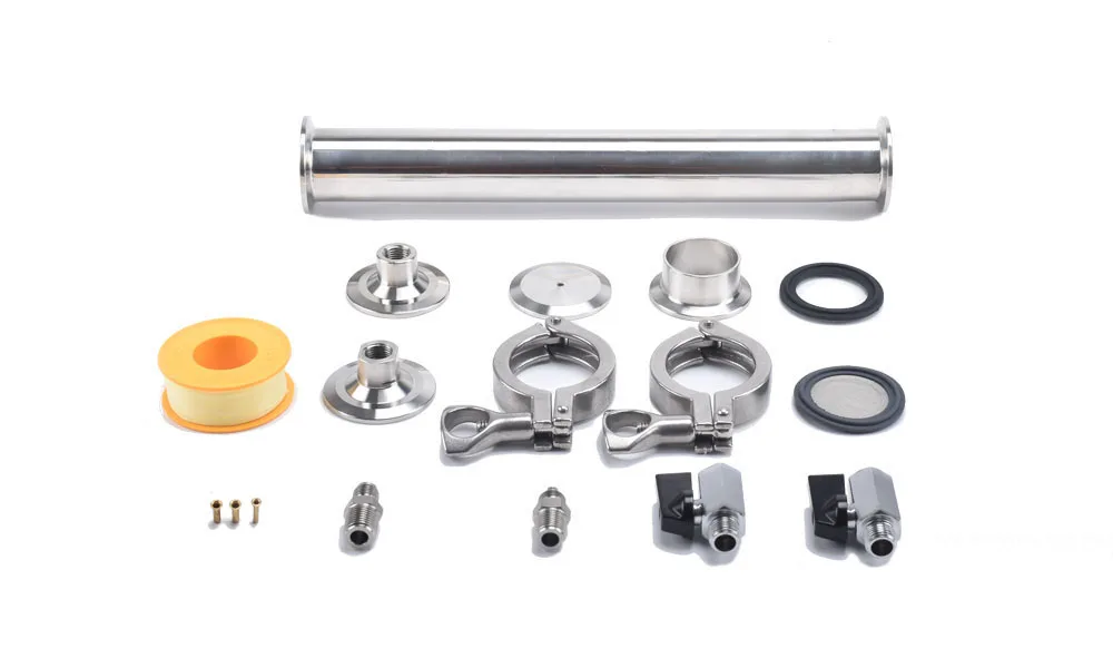 1x1,5 "твердый Торцевая крышка с 3 мм отверстием2xстандартный зажим давления2x1/4 "высокого давления шаровой клапан, FNPT, SS304.2x1,5 "1/4" FNPT торцевые крышкиТрубка из нержавеющей стали 1x30 41x1,5 "Наконечник1x1,5 "трёхзажимного хомута дисплей/epdm/100 сетки (150 мкм) прокладка1 х Viton tri-clamp 1,5 "прокладка1x Петро-лента (PTFE труба лента)