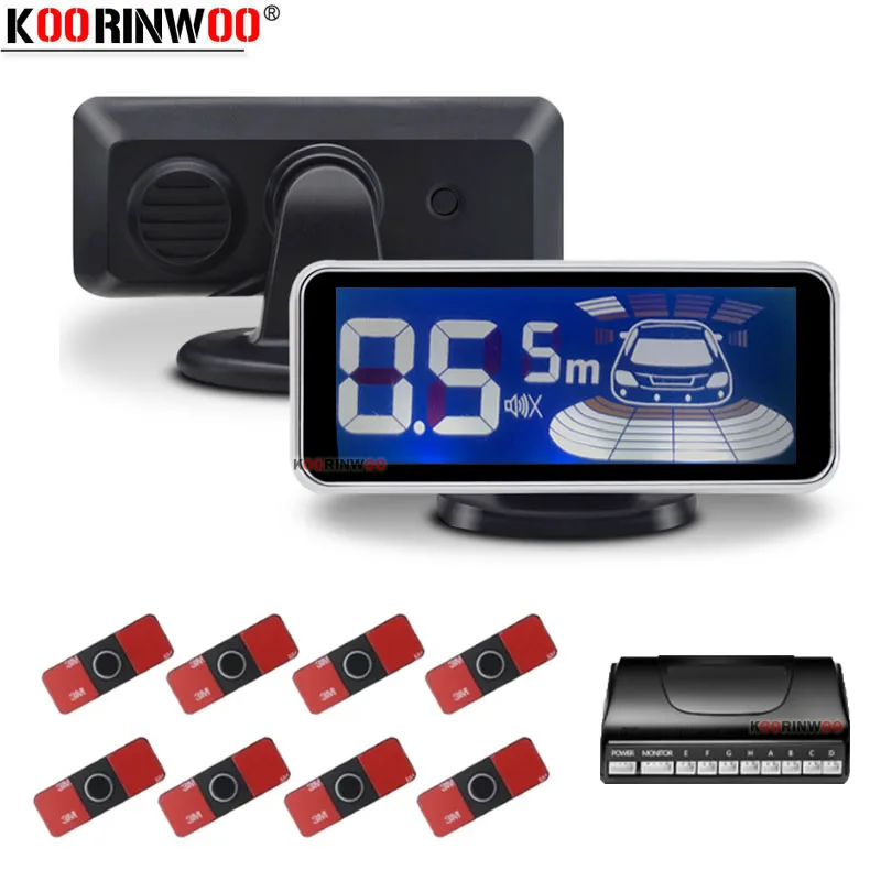 Автомобильные парковочные датчики Koorinwoo с ЖК-экраном, 8 радарами, детектор, фронтальный + задний человеческий голос, звуковой сигнал, парктроника, 16 мм, плоская сигнализация 12 В