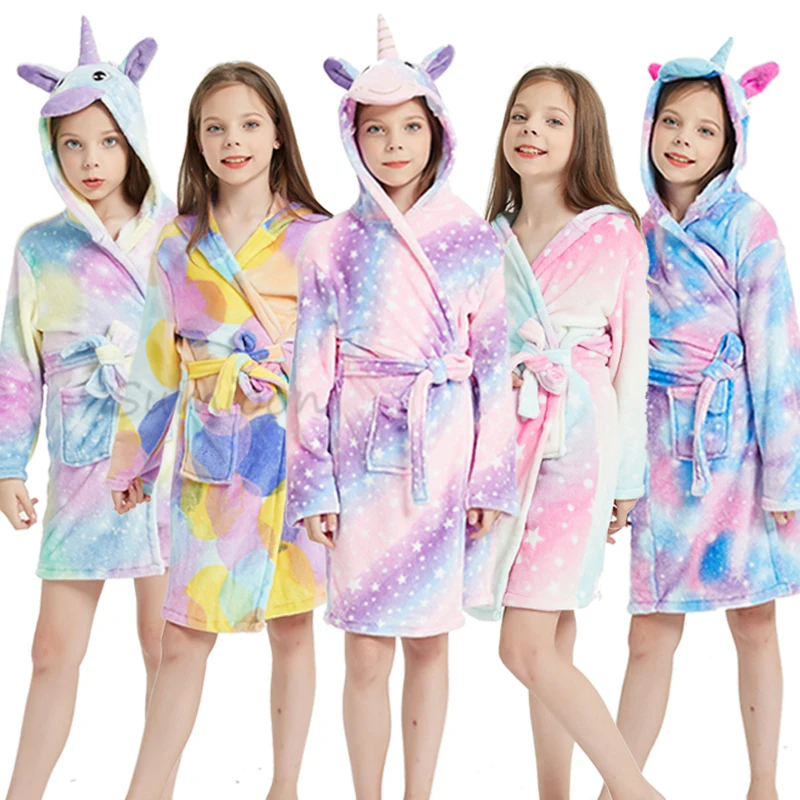 Детский фланелевый Халат Kigurumi, флисовый банный халат с капюшоном для мальчиков и девочек, мультяшный рисунок единорога, Осень-зима