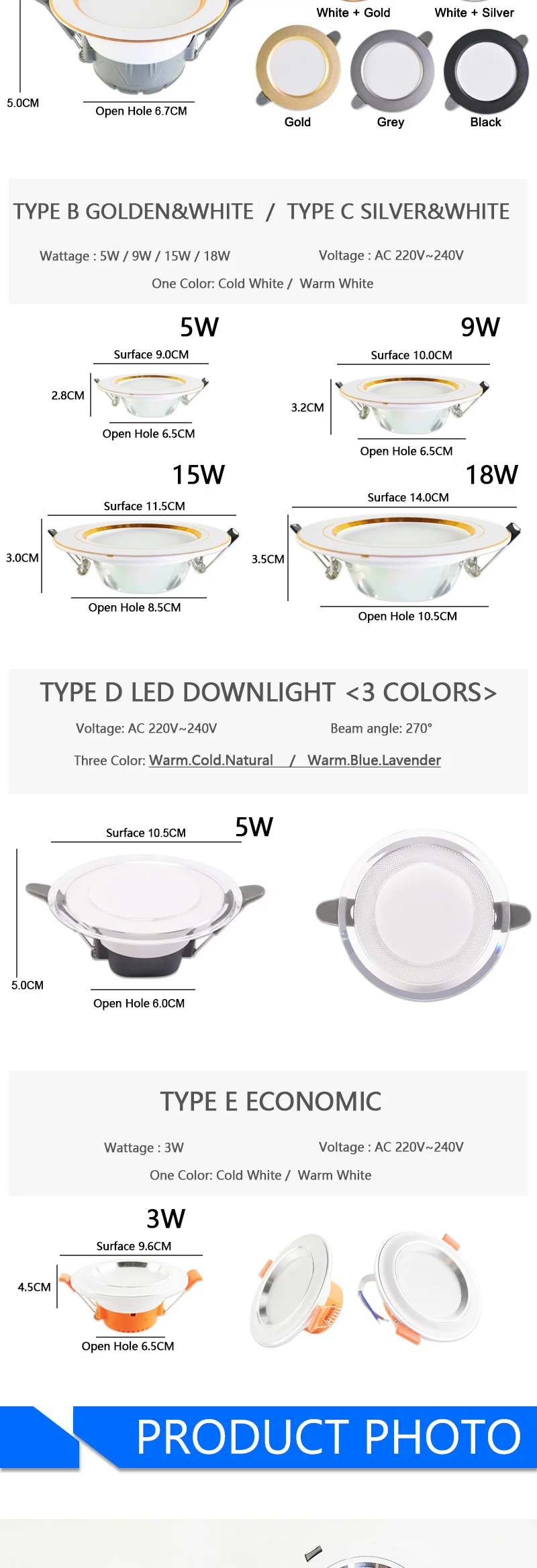 Светодиодный Светильник направленного света, круглая Встраиваемая потолочная лампа, комнатное освещение шести цветов, 3 Вт, 5 Вт, 9 Вт, 12 Вт, 15 Вт, 18 Вт, 220 В, 230 В переменного тока