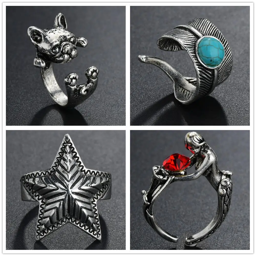 Кольцо мужскоеженское в ретро стиле, готическое кольцо с синим камнем, перьями, крестом, звездами, в стиле хип-хоп, вечерняя бижутерия