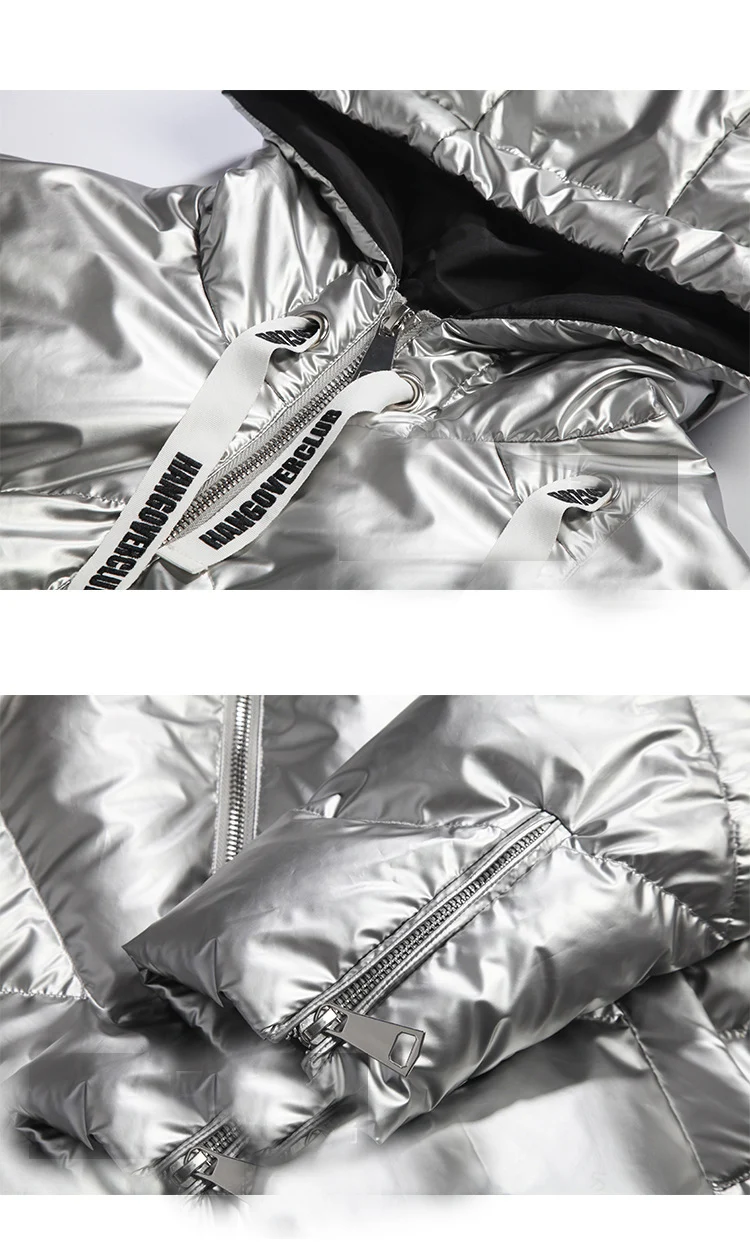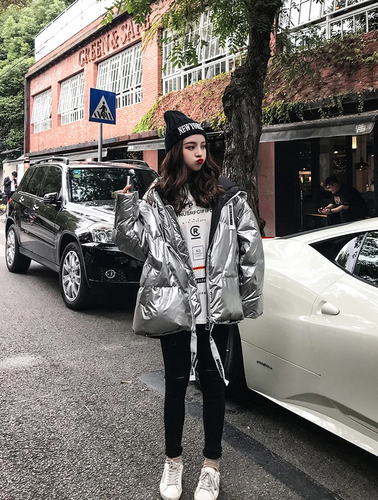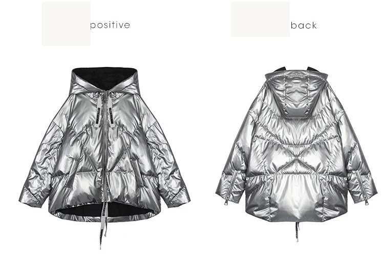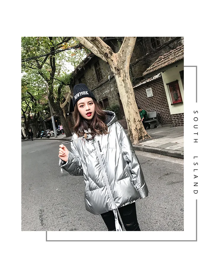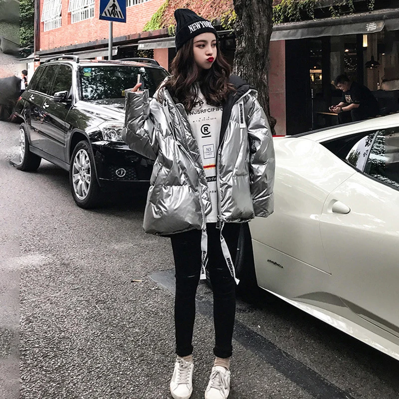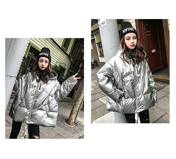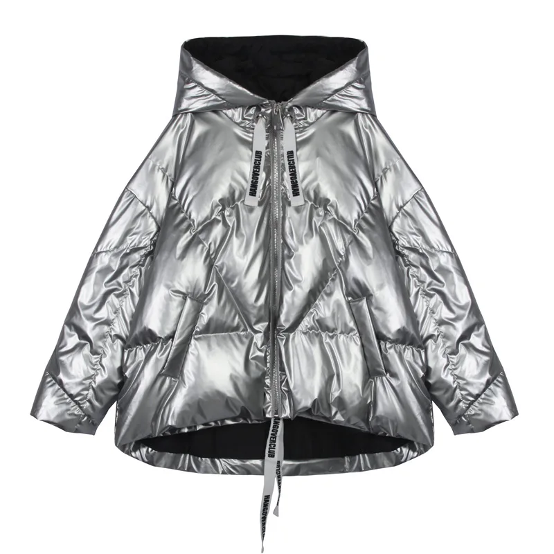 Женская куртка 2021 зима новый Серебристый Сияющий Модный пуховик короткий мягкий корейский Свободный длинный рукав с капюшоном Яркое пальто 39M