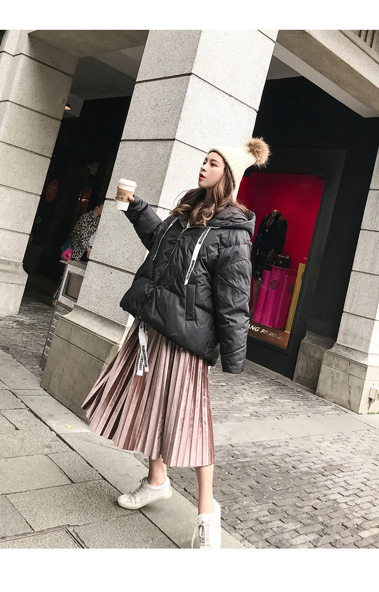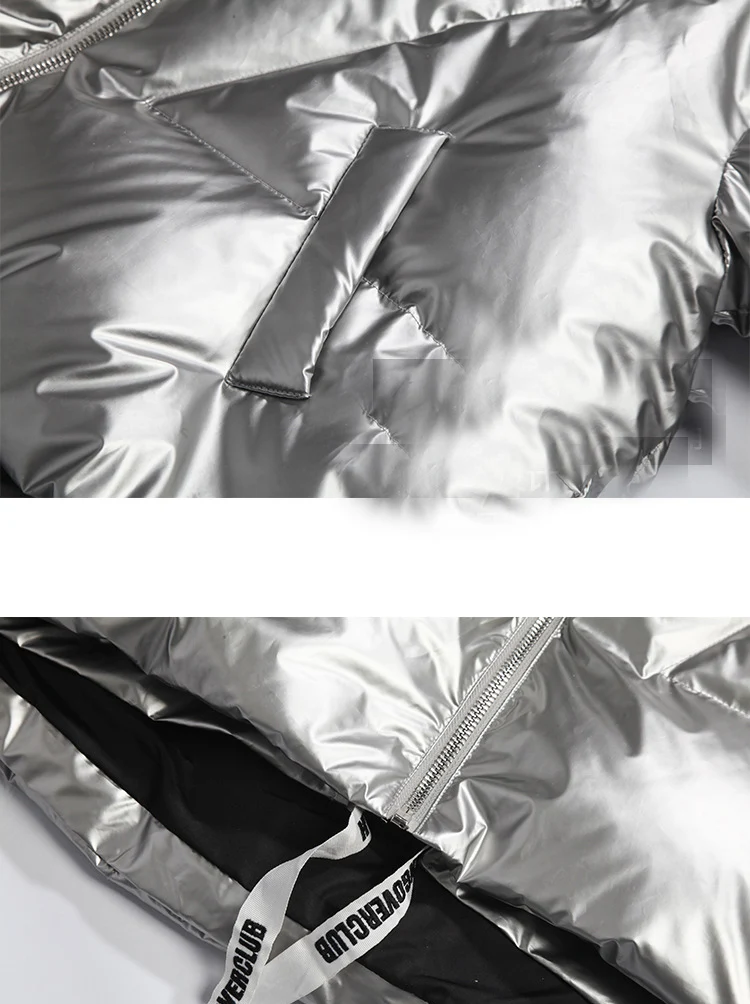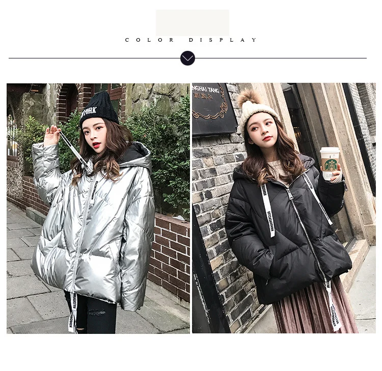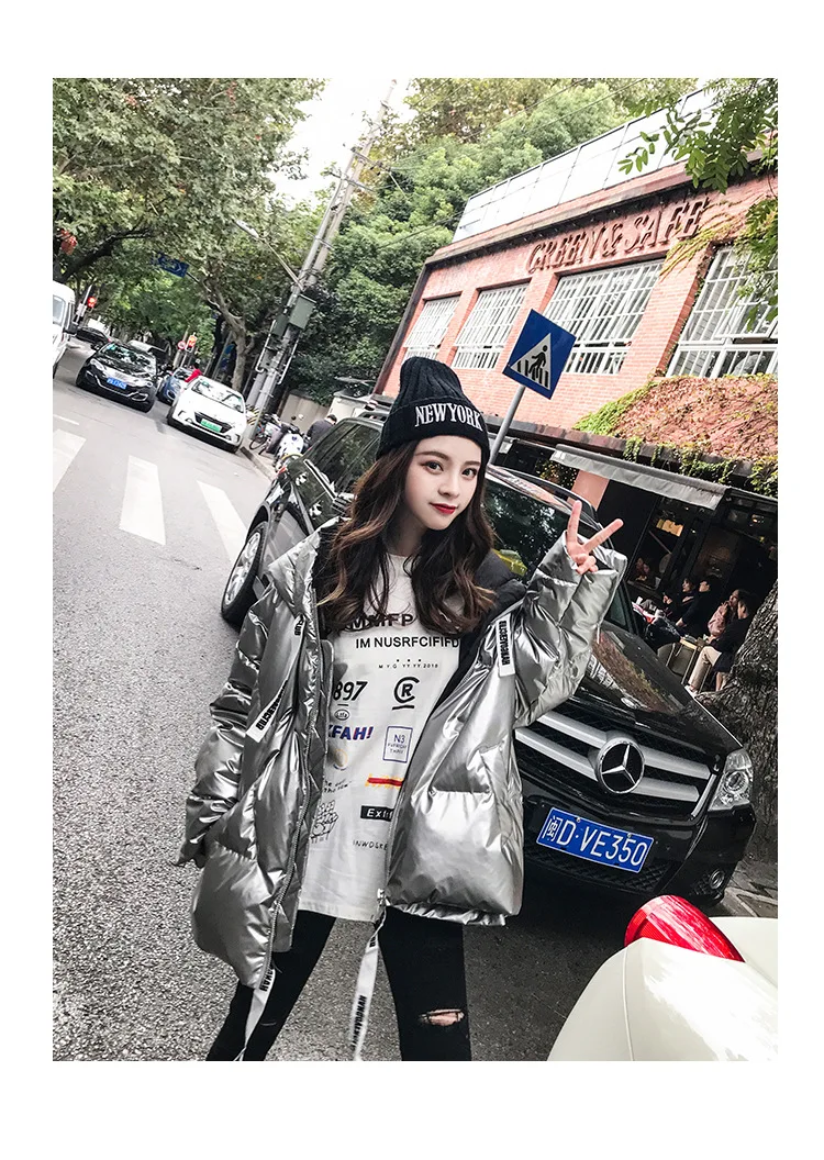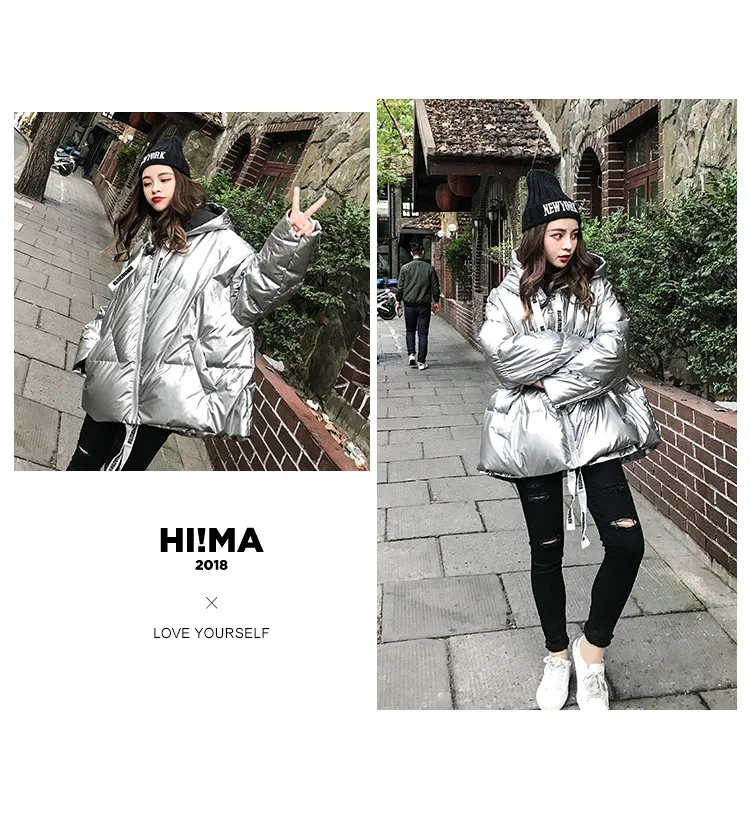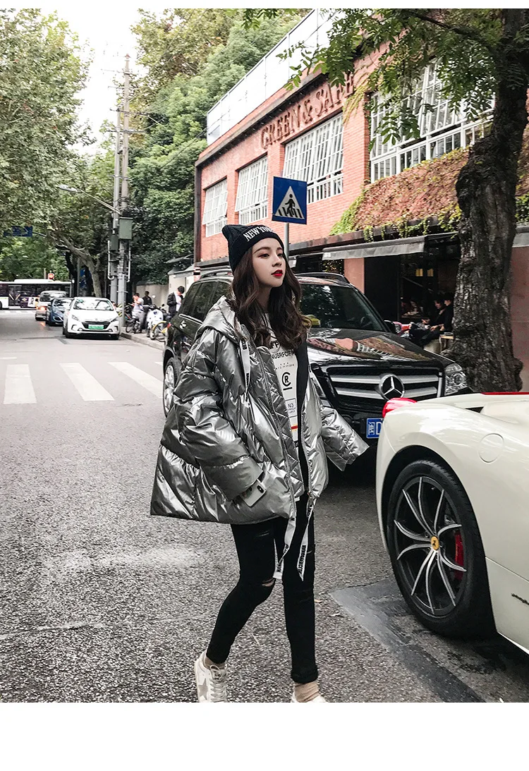 Женская куртка 2021 зима новый Серебристый Сияющий Модный пуховик короткий мягкий корейский Свободный длинный рукав с капюшоном Яркое пальто 39M