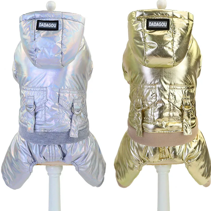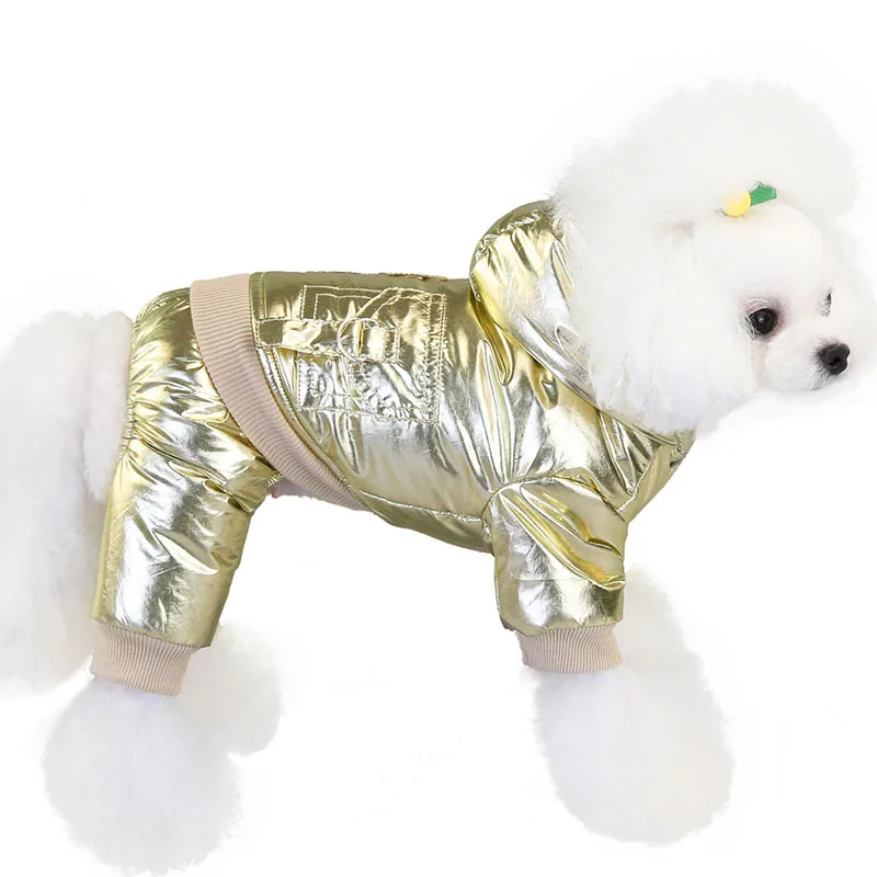 Ослепительно Металла Цвет теплая одежда комбинезоны с изображением собаки для мальчиков, зима, 4 ноги собака с капюшоном пуховик для маленькой собаки чихуахуа комбинезон для домашних животных