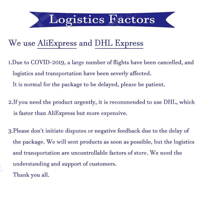 1. Обычно мы отправляем товар в течение 1-2 рабочих дней после того, как ваш платеж будет проверен Aliexpress.2. Если вы выбираете DHL пересылку и ваш адрес определяется как удаленная область DHL, вам нужно будет оплатить дополнительную $38 плату за удаленную доставку. Или, пожалуйста, дайте нам новый другой адрес, который не удален. Удаленная область проверить по ссылке.Https://www.dhl.com/content/dam/downloads/g0/express/services/surcharges/dhl_express_remote_areas.pdf3. Если у вас есть какие-либо изменения для заказа, пожалуйста, оставьте сообщение в заказе.4. Пожалуйста, проверьте ваш адрес и контактный номер правильно, особенно проверьте ваш почтовый индекс и город правильной информации, в противном случае ваша посылка не будет отправлена.