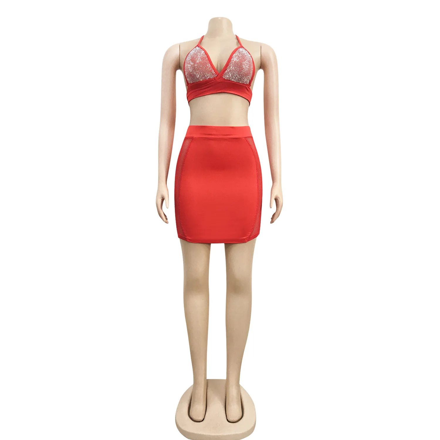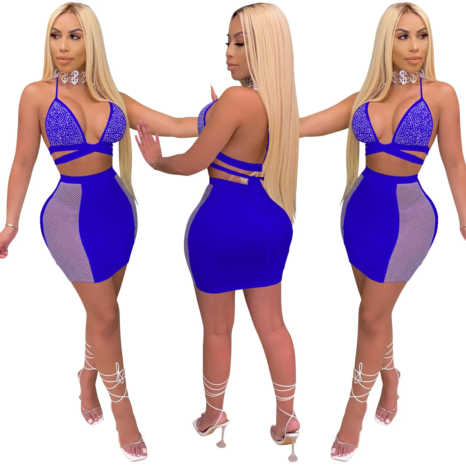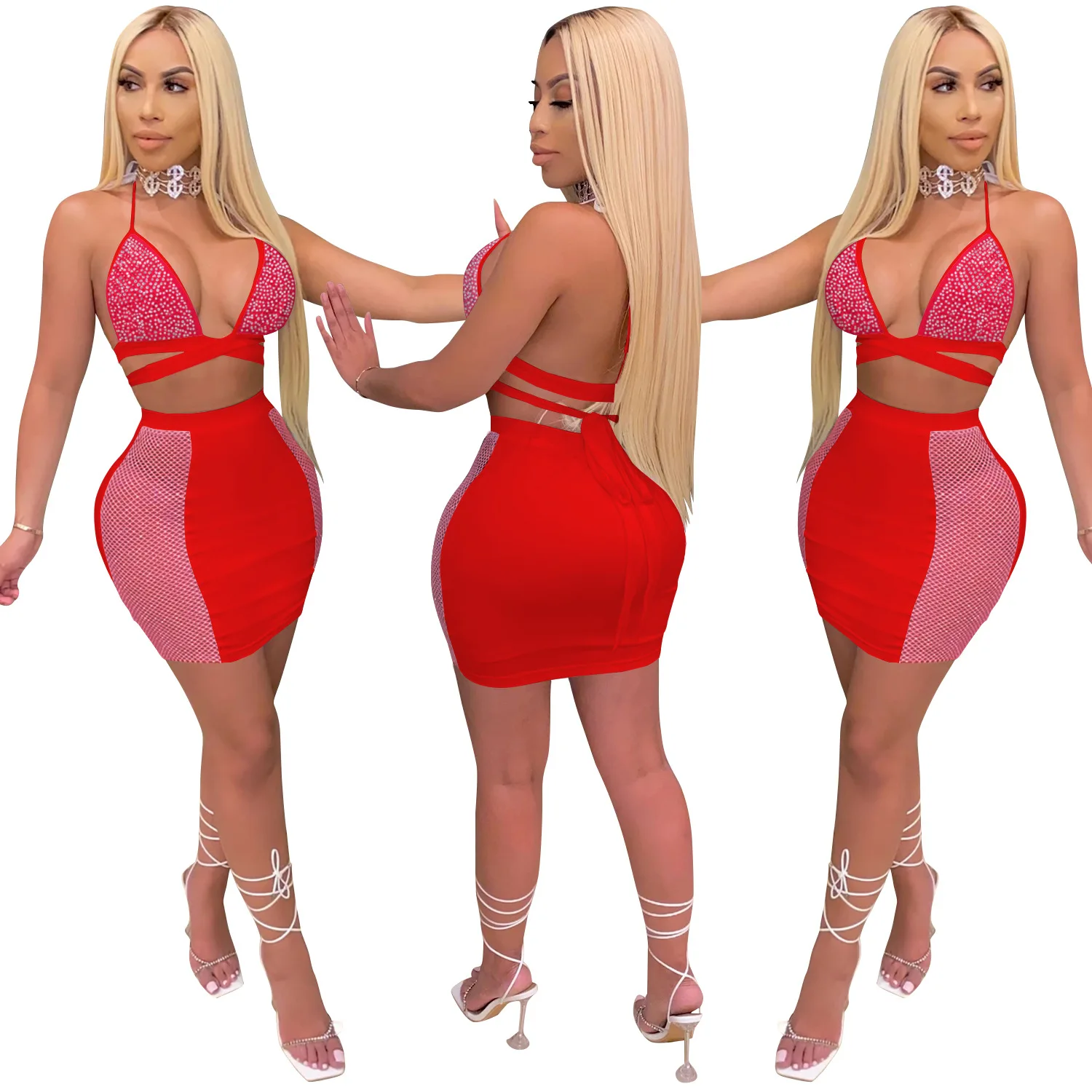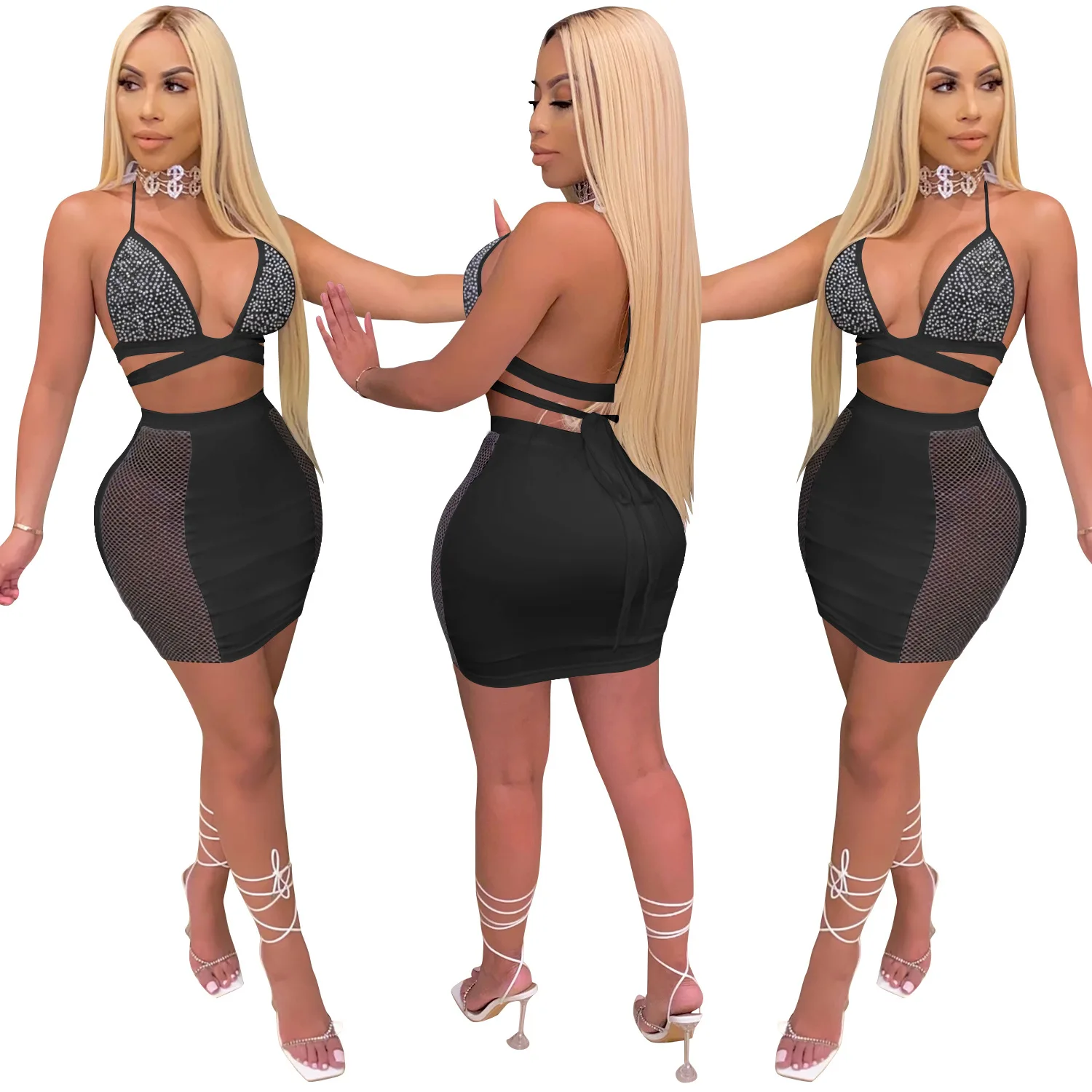 Сексуальные Стразы Zoctuo, комплект из 2 предметов со стразами, Женская Клубная вечерние, комплект из двух предметов, топ на бретелях-спагетти и мини-юбка