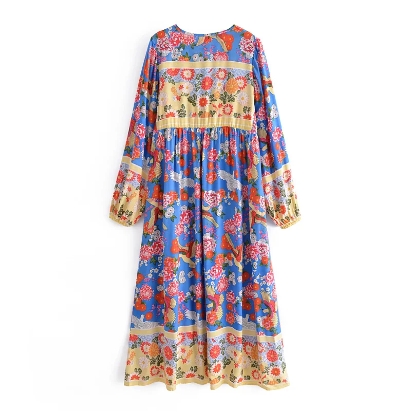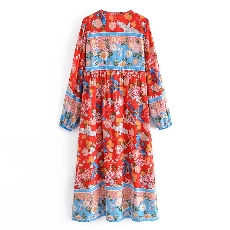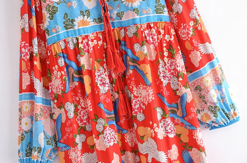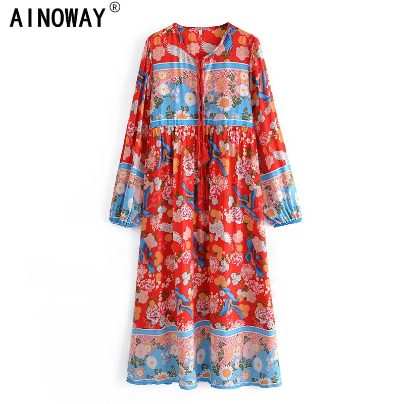 Винтажное шикарное модное женское Платье макси с длинным рукавом, галстуком-бабочкой, этническим цветочным принтом, Пляжное богемное платье, женское платье из вискозы и хлопка в стиле бохо