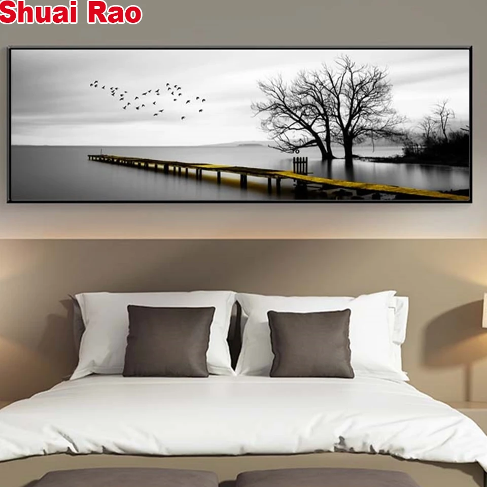 Алмазная живопись 5d сделай сам с большими птицами, деревом, озером, полная выкладка, вышивка крестиком, набор мозаики с черным и белым пейзажем,