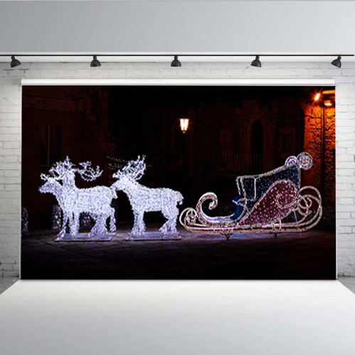Зима Рождество олень сани улица светящиеся дома красивая зимняя фотография Фон ребенок портрет фото