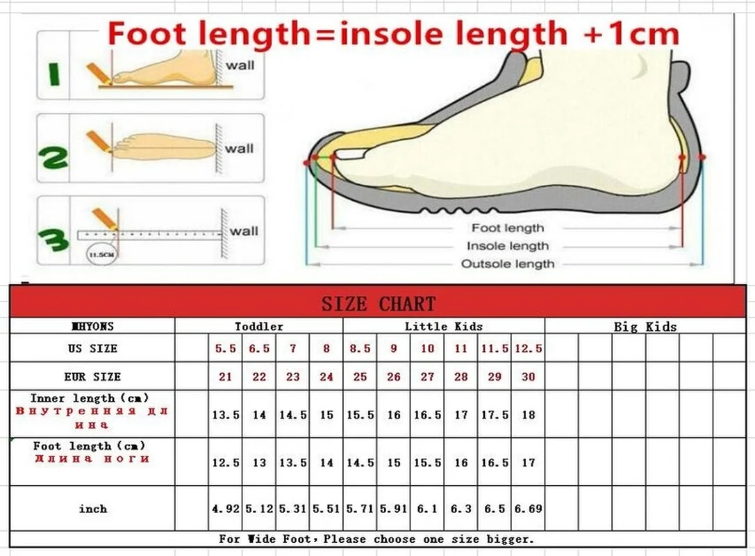 Поскольку все размеры детской обуви отличаются, при заказе детской обуви вы должны соответствовать нашим размерам и внутренней длине.