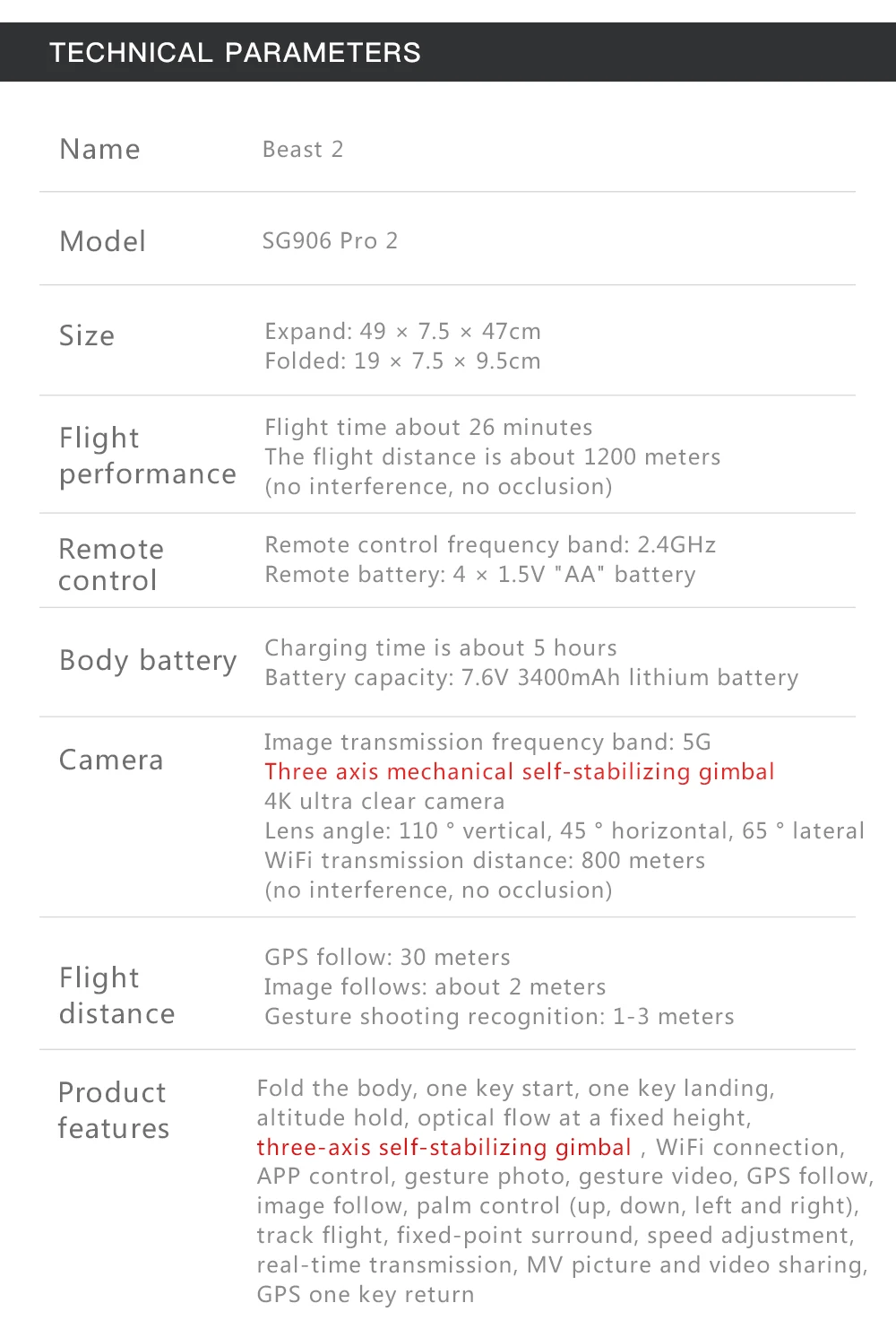 Название продукта: SG906Pro2Бесщеточный двигатель: 1806Трехосный стабилизированный механический наклон панорамированияПоддержка tf-карты: до 32 ГбСпособ приема WIFI для смартфона: 5G WIFIУдаленное получение метод: 2,4 ГГцВыносливость полета: 25 минВремя зарядки: 360 минРасстояние дистанционного управления: 1200 мБатарея фюзеляжа: 7,6 V 3400mAhФюзеляжа Размер: 28,3x25,3x7 см (в открытом виде) 17,4x8,4x7 см (в сложенном виде)Вес тела: 551,8 гУгол поворота Elc. Поворотная Камера: 110 °Угол аэрофотосъемки: 120 °Расстояние возврата изображения: 600-800 мВысота полета: около 0-120 мРасстояние GPS:30 мРасстояние изображения: 3-10 мРаспознаваемое расстояние фото жестов: 1-3 мСкорость передачи кадров: 25 кадров в секундуРазрешение фото: 4096*3072(TF)4096*3072 (приложение)Разрешение видео: 2048*1080(TF)1208*720 (APP) режим HD: 2048*1080(APP)Посылка: цветная коробка или чехол для переноски или сумка для переноскиПосылка Вес: около 1,4 кг