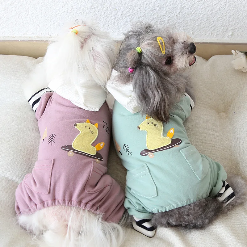 Осенне-зимняя одежда для йорков с принтом маленькой лисы, теплая одежда для домашних животных с четырьмя ногами и шапкой, комбинезон для домашних животных с хлопковой подкладкой для собак
