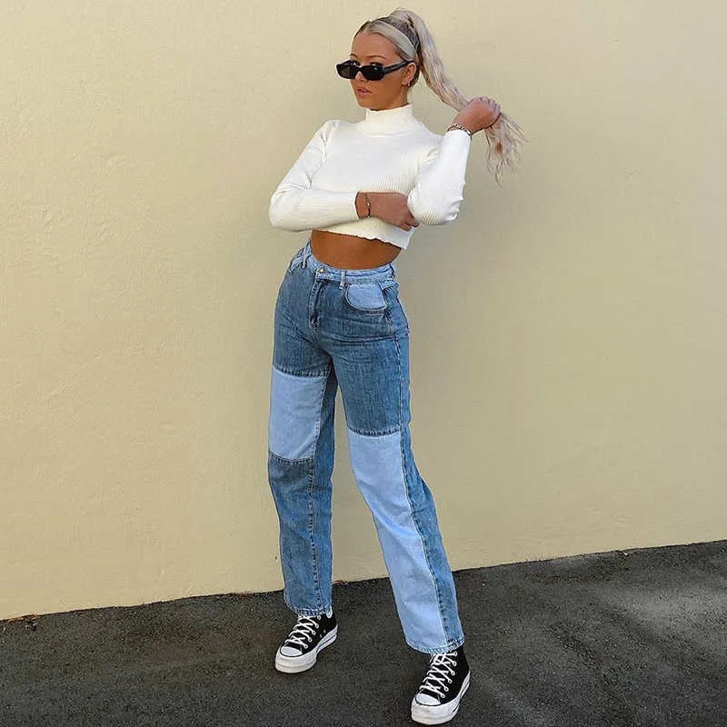 Женские прямые брюки в стиле пэчворк с высокой талией, уличные джин...