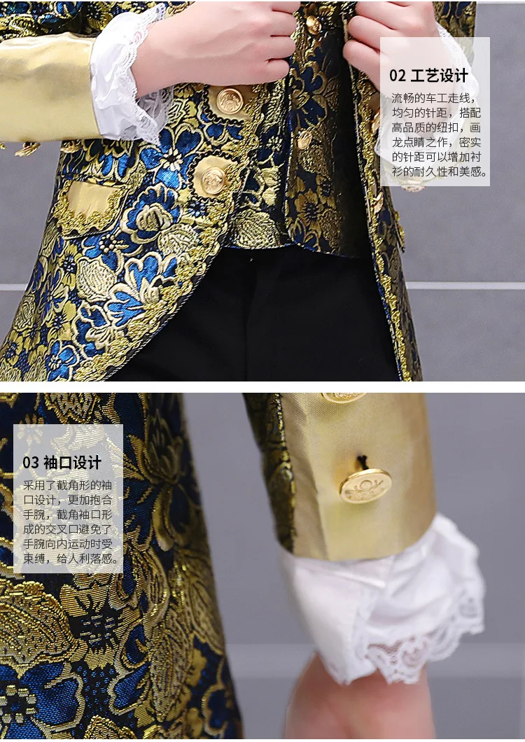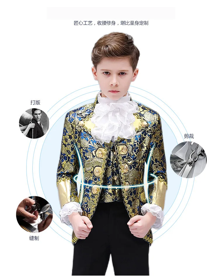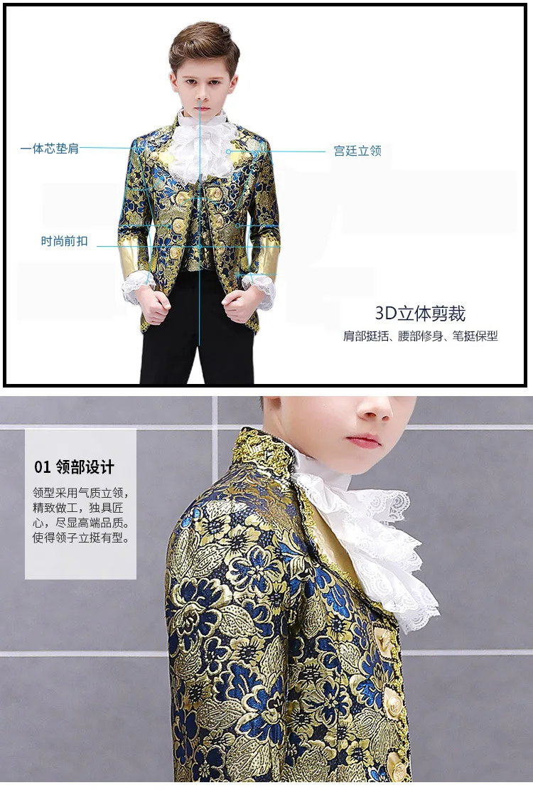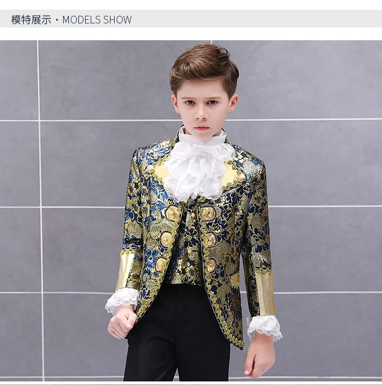 Комплект одежды в ретро-стиле для мальчиков, очаровательный костюм Принцесса для выступлений, Блейзер, жилет, брюки, воротник, Цветочный наряд