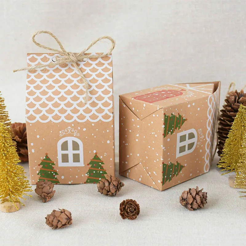 5 шт. Рождественская коробка для конфет, Подарочная коробка из крафт-бумаги в форме домика с пеньковой веревкой для нового года, рождевечерние, домашний декор, пакет для печенья