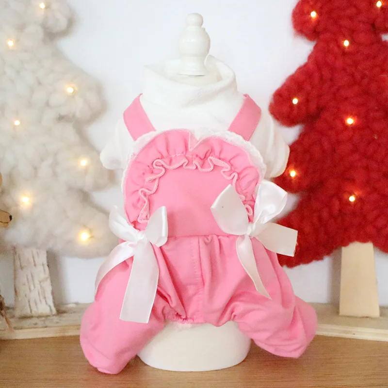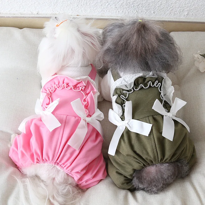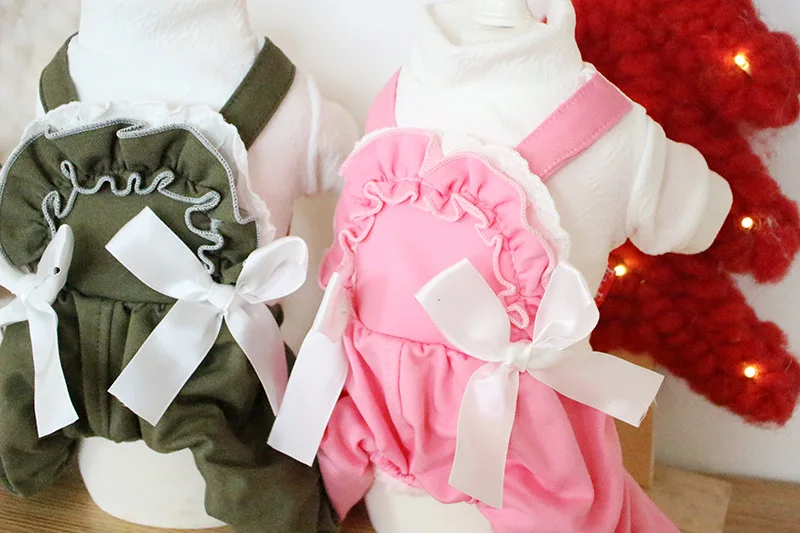Кружевной дизайн с бантом, одежда для собак зеленого и розового цвета, осень и зима, толстая стеганая одежда для домашних животных с четырьмя ногами из хлопка, одежда для собак