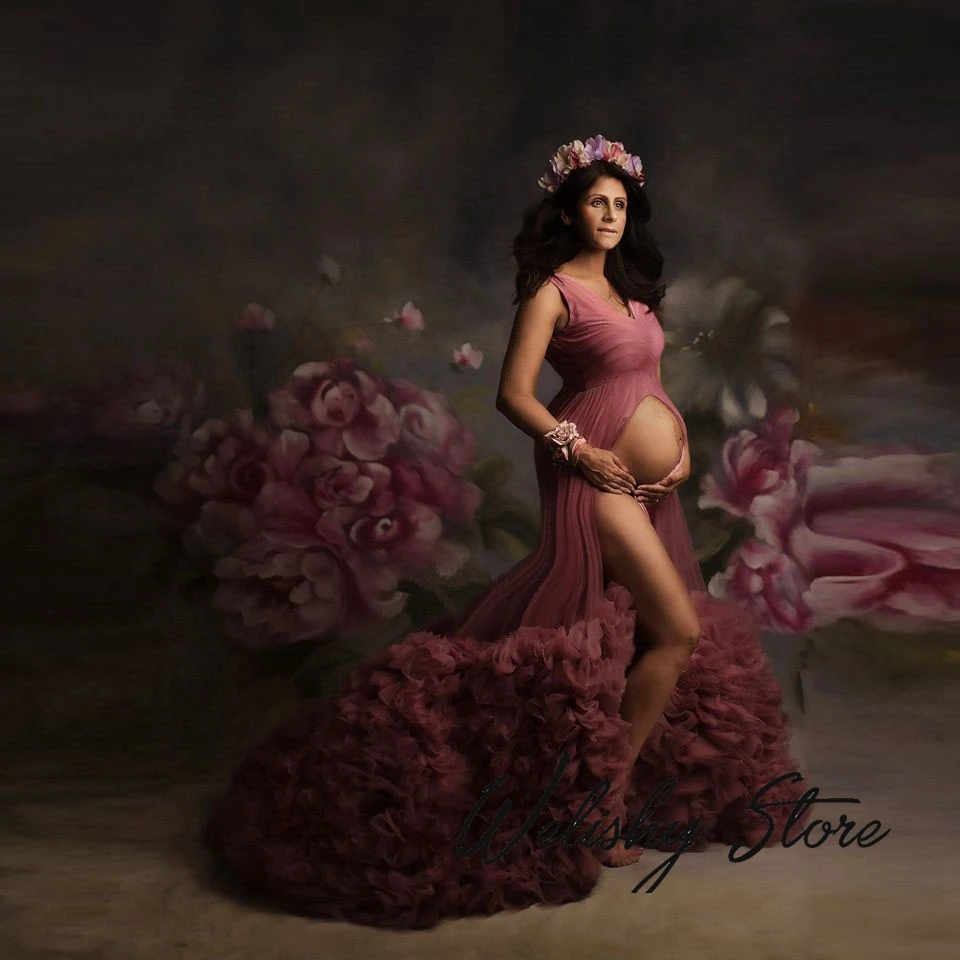 Соблазнительные Свадебные пышные платья из тюля с оборками 2020, женское платье для беременных с V-образным вырезом и высоким разрезом на выпускной, длинное вечернее официальное платье для фотосессии