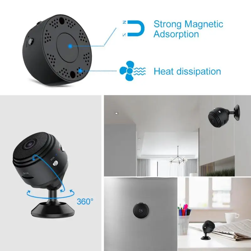 -Эта маленькая ванная комната имеет встроенный Магнит, может хорошо работать с любым железным материалом, легко помещается в любом месте. Эта маленькая камера с жестким зарядным кабелем и волшебным основанием, при зарядке во время записи, вы можете вручную повернуть угол записи на 360 градусов.