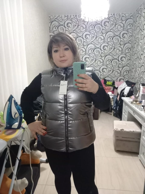 Жилетка супер!В точности как на фото.Ткань чуть поблёскивает.На свой 48 размер,взяла 3XL.Хотела чтобы посвободней была и не ошиблась.Пришла быстро.Рекомендую!