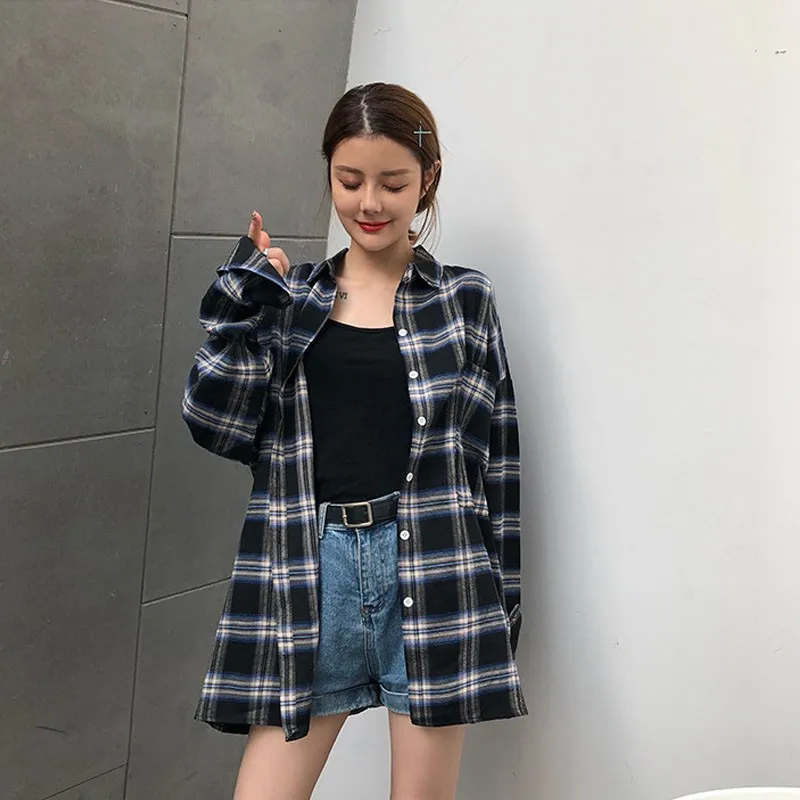 Осенняя Женская длинная рубашка в клетку, повседневная хлопковая рубашка с длинным рукавом в Корейском стиле, черные женские топы с отложным воротником, 2020