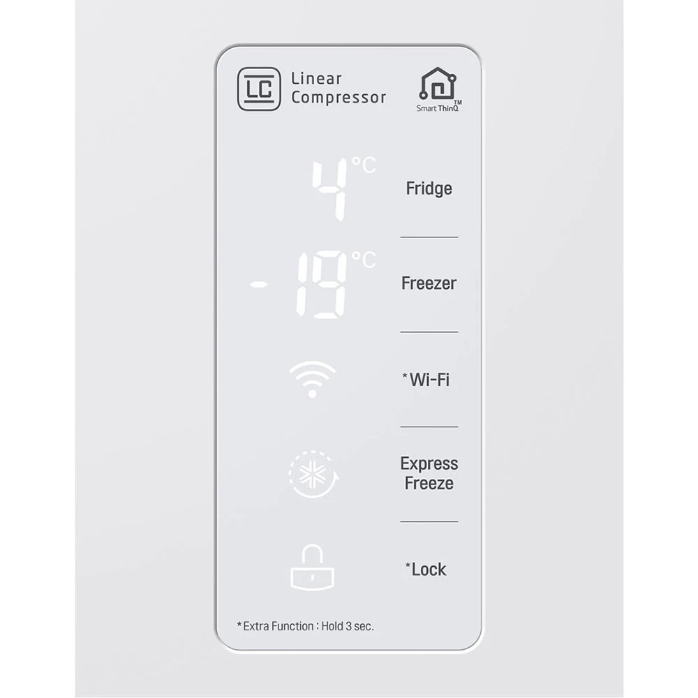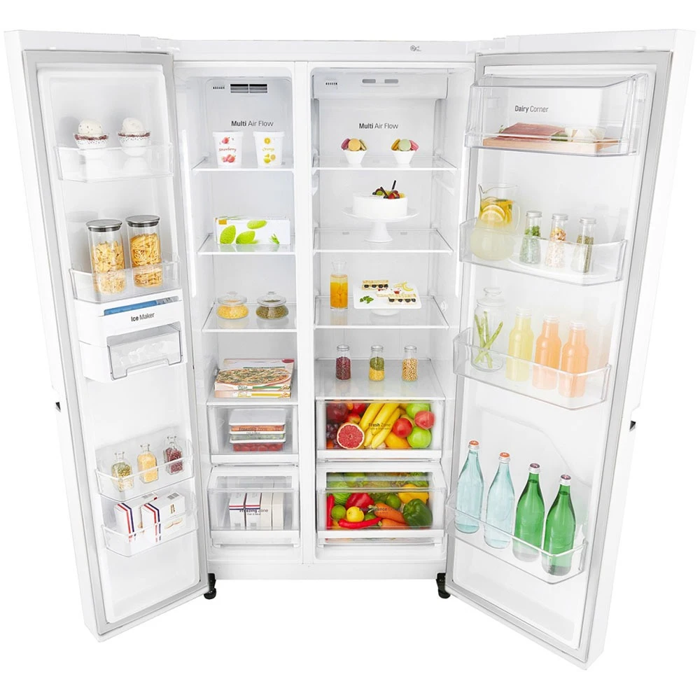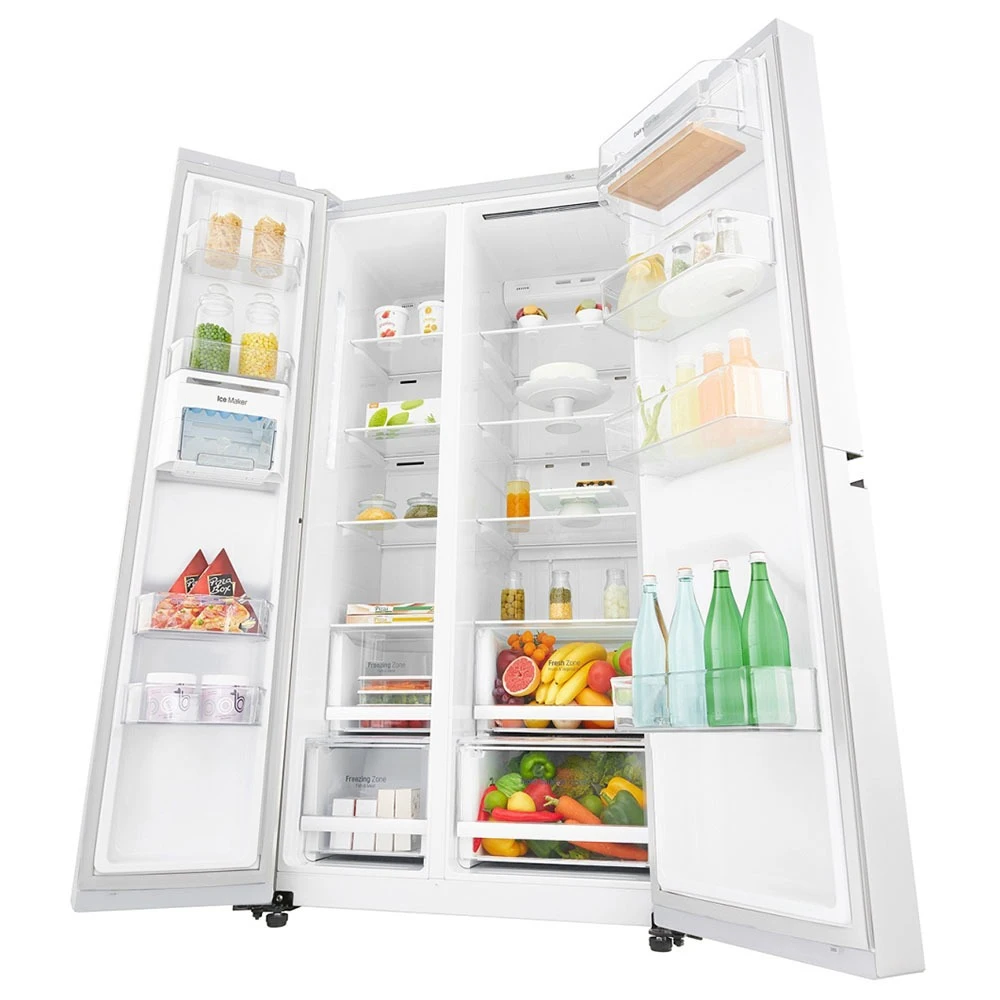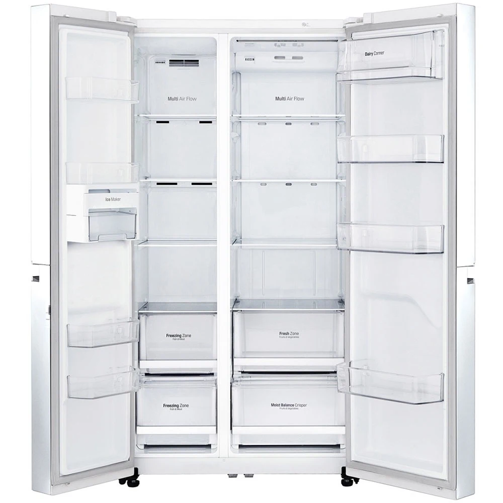 Основные характеристики - Тип: Side bДа Side - Тип установка: отдельностоящий - Тип компрессора: линейный инверторный - Количество компрессоров: 1 - Количество камер: 2 - Общий полезный объем: 626 л Холодильная камера - Объем холодильной камеры: 406 л - Регулировка температуры в холодильной камере: да - Размораживание холодильной камеры: No Frost Морозильная камера - Объем морозильной камеры: 220 л - Расположение морозильной камеры: слева - Размораживание морозильной камеры: No Frost - Мощность замораживания: 12 кг/сутки - Хранение продуктов при отключении питания: 10 ч - Регулировка температуры в морозильной камере: да Зона свежести - Зона свежести: есть Генератор льда - Генератор льда: есть Управление - Тип управления: электронное - Способ управления: кнопочный - Расположение панели управления: на дверце - Поддержка Wi-Fi: да - Управление c мобильного устройства: да - Поддержка мобильного приложения: LG ThinQ Дисплей - Тип дисплея: LED - Дисплей: да Индикация - Индикация температуры морозильной камеры: да - Индикация температуры холодильной камеры: да - Индикация режима работы: да - Индикация открытой двери: звуковая Электропитание - Класс энергопотребления: A+ - Энергопотребление: 438 кВтч/год - Климатические класс: T - Уровень шума: 39 дБ Защита и безопасность - Тип сигнализации: акустический - Сигнализация об открытой двери: да - Самодиагностика неисправностей: да - Защита от детей: да Освещение - Освещение холодильной камеры: да - Освещение морозильной камеры: да - Тип освещения: LED Функции и возможности - Суперзаморозка: да Особенности конструкции - Количество дверей: 2 - Ручка легкого открывания: да - Встроенный вентилятор для распределения температуры: да Контейнеры и полки - Количество полок в холодильной камере: 4 - Регулируемые по высоте полки в холодильной камере: 1 - Количество полок в морозильной камере: 4 - Количество полок на дверце холодильной камеры: 4 - Количество полок на дверце морозильной камеры: 4 - Количество контейнеров в холодильной камере: 1 - Количество контейнеров в морозильной камере: 2 - Количество контейнеров в зоне свежести: 1 - Подставка для яиц: да Покрытие - Материал покрытия: PCM Цвет и материал - Цвет: белый - Цвет полок: белый, прозрачный - Цвет ящиков: белый, прозрачный - Материал двери: металл - Материал полок: стекло - Материал ящиков: пластик Размеры и вес - Высота: 179 см - Ширина: 91.2 см - Глубина: 73.8 см - Вес: 113 кг
