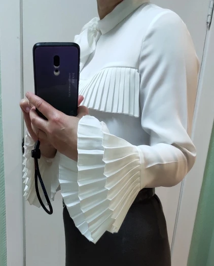 Идеальное фабричное качество, придраться не к чему! Описание четкое. На ог 90 (размер s/m, 36/38 или 44рус) взяла м. Голимый полиэстер (это есть в описании, шелк не обещают!) , плотный, держит форму. Хорошее плиссе. Цвет приятный, молочный. Отвыкла от искусственных тканей, поэтому первое впечатление было бэ( Но! Имеет место быть для официоза какого-нибудь ... на каждый день не рекомендую конечно. Рукава и бант очень украшают и придают офигенно нарядный вид) Прям училка на 1 сентября))) Рукава. На рост 164 до начала фалангов пальцев. Пройма. По ощущениям хотелось бы чуть поглубже. Она прям впритык. Длина блузончика до середины бедра. Кстати, хорошо смотрится с необычными жилетами и модными говнодавами! Этакая осовремененная классика. Вобщем, кому нужна такая история, рекомендую с чистой совестью.