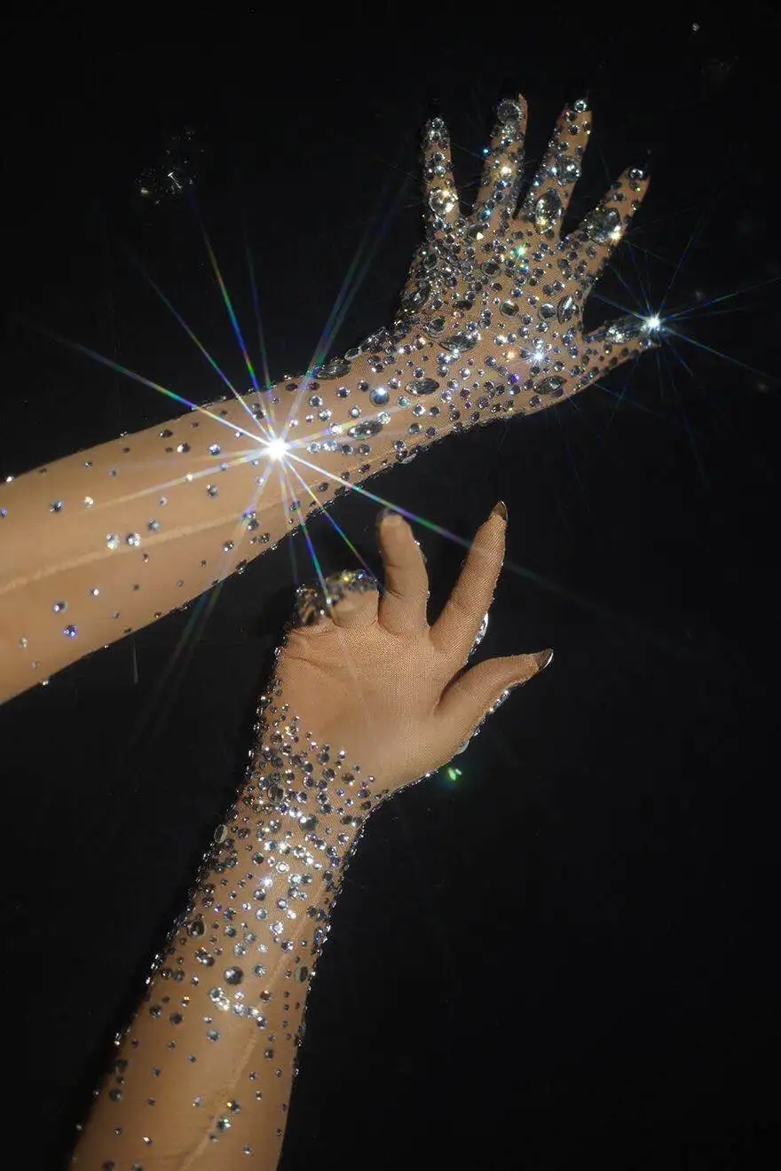 Роскошные тянущиеся перчатки со стразами, женские блестящие сетчатые длинные перчатки с кристаллами, танцовщица, певица, для ночного клуба, для танцев, сцены, шоу, аксессуары
